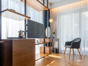 The COCO Chair is a versatile and stylish seating option perfect for both residential and commercial spaces, including hotel rooms, lobbies, bars, and restaurants. Featuring a sturdy structure made from multilayered wood panels and flexible polyurethane foam, it offers comfort and durability. The two-tone painted metal legs add elegance, while the shaped polyurethane seat cushion…
