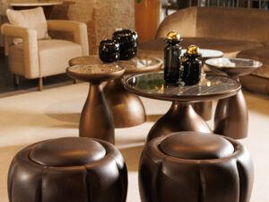 Selena poufs by Able Design Studio feature a captivating design inspired by blooming flowers, with vertical padding motifs adding elegance. The high-quality fabric upholstery reflects light, creating stunning visual effects. The bright laminated wood bases come in seven finishes, including copper, brass, and gunmetal, allowing for seamless customization. Upholstered in a wide range of fabrics…