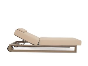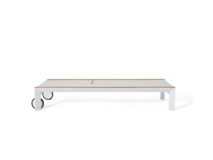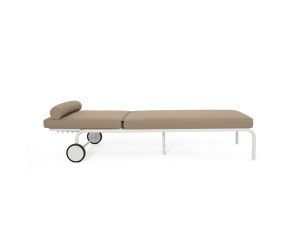 Introducing Flow , a soft-shaped lounger featuring a metal structure, rotating wooden wheels, and a padded waterproof cushion. Structure: Aluminum Fabric: Water repellant Wheels: Wooden Fixed head cushion Size: 212cm W x70cm Dx 38 cm H