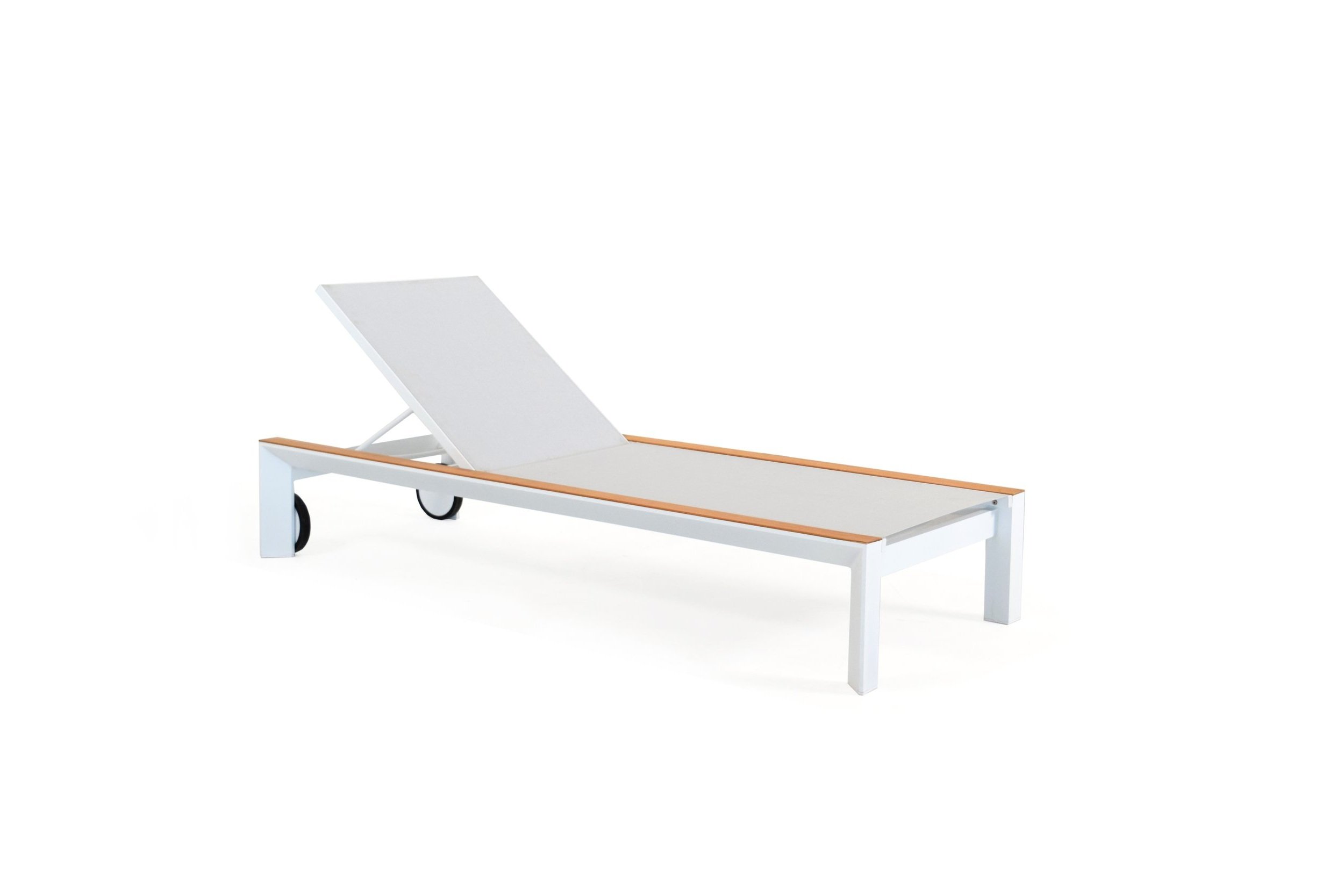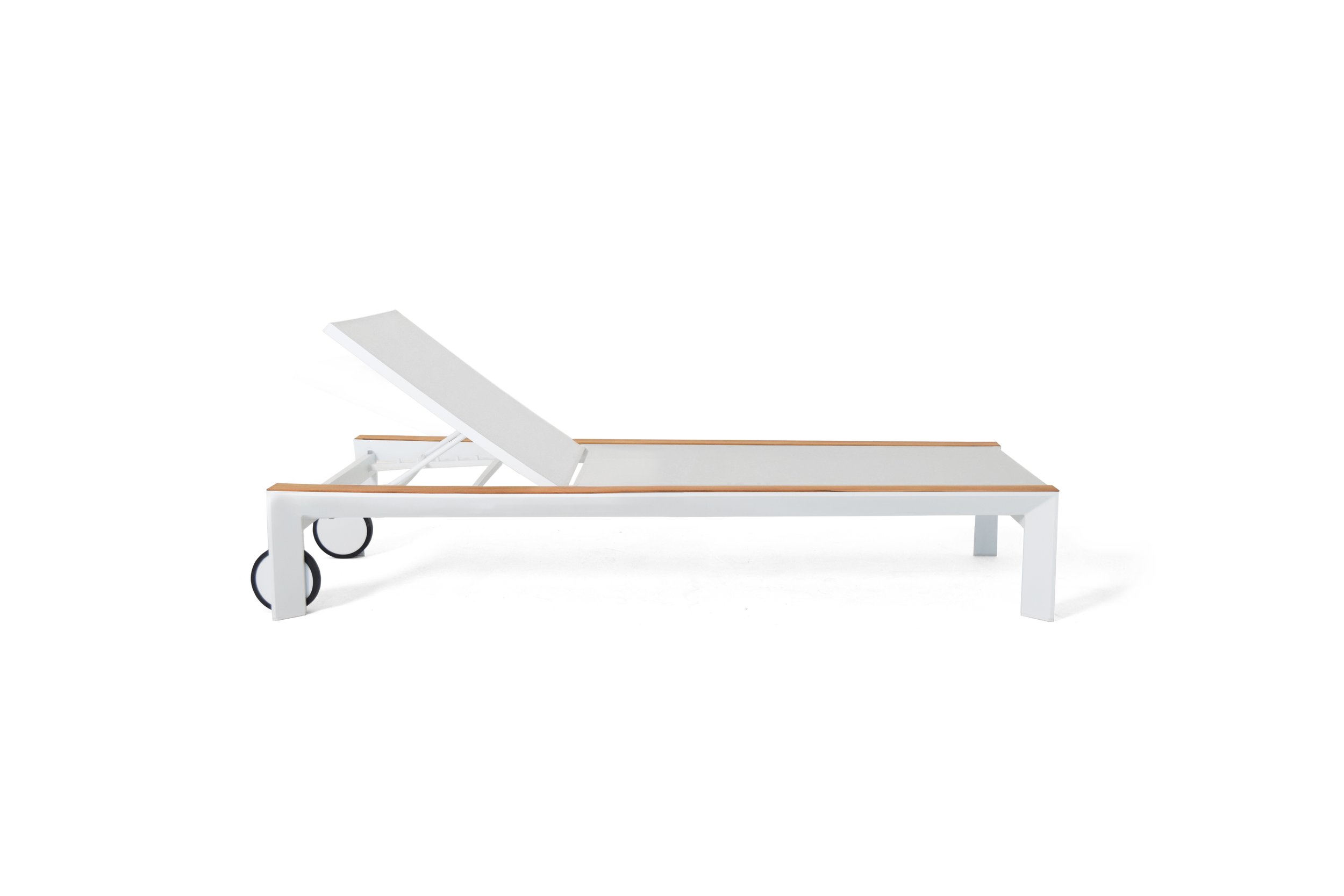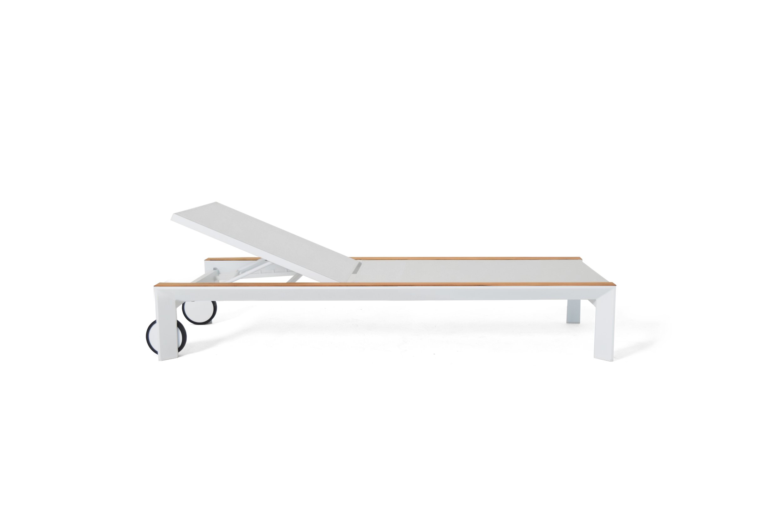 Azul is a high-tech aluminum sun lounger with washable emu tex fabric, hidden mechanisms, and an innovative lock system. It has wheels, armrests, and a stackable design.