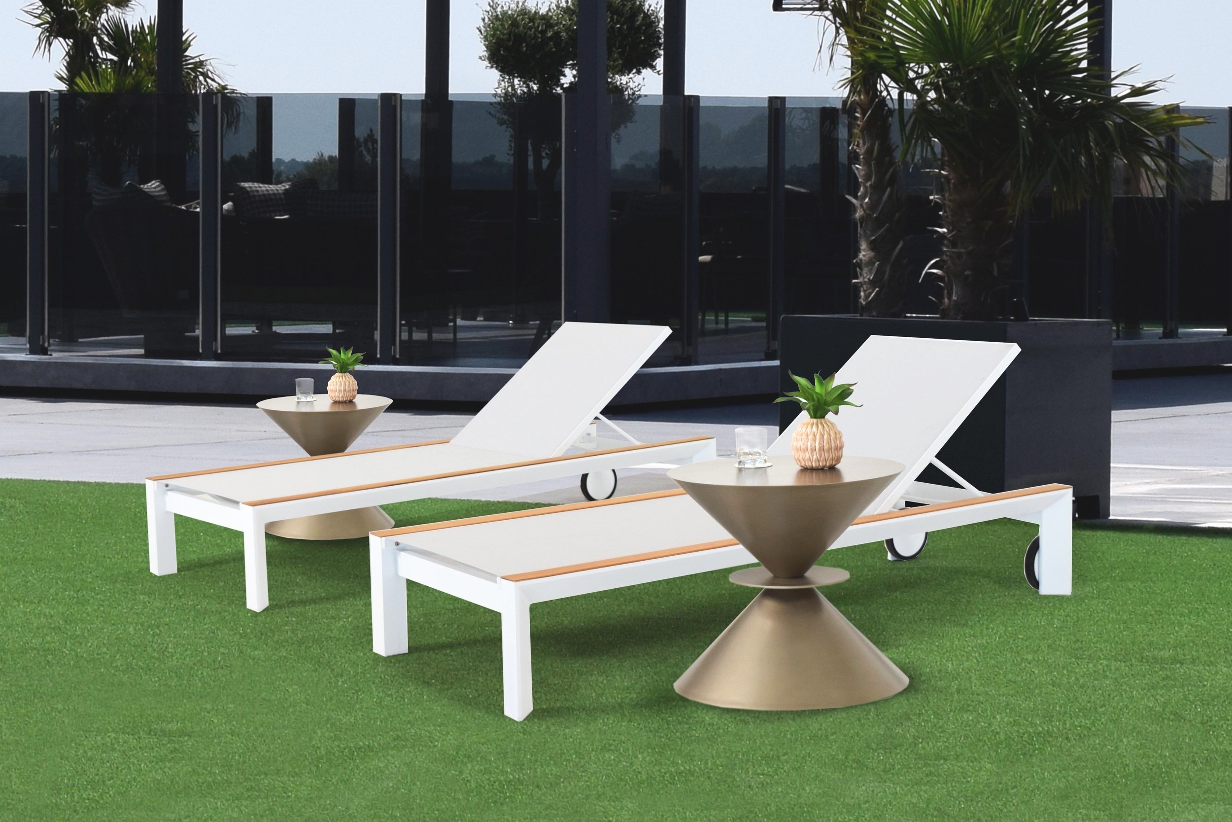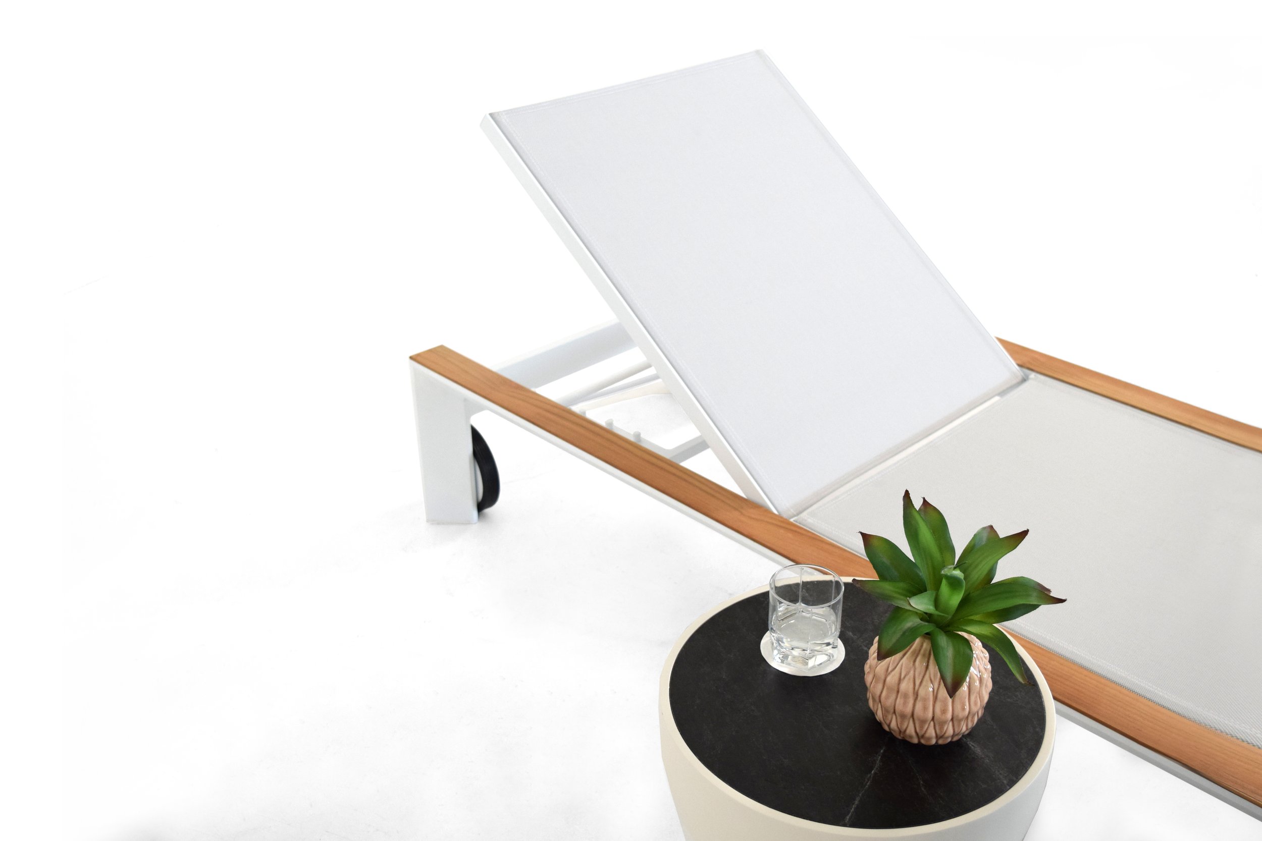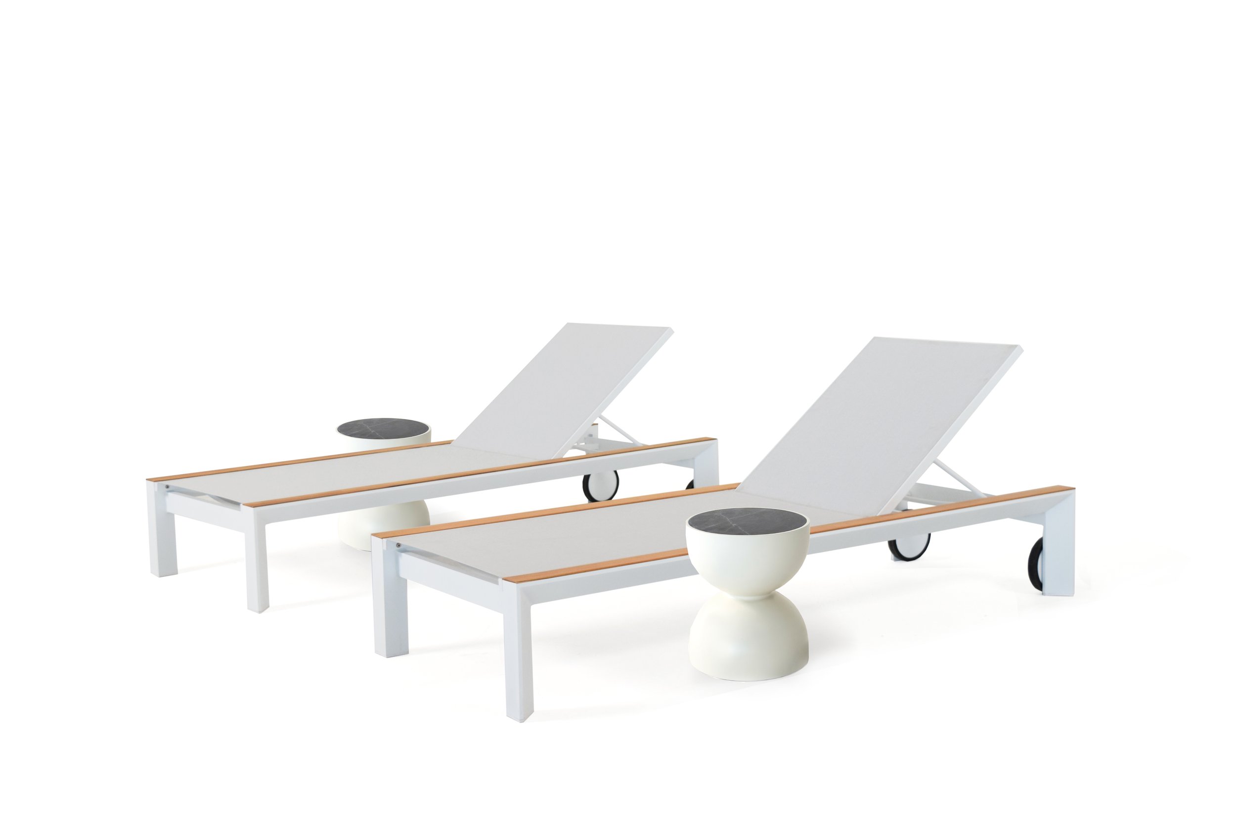 Azul is a high-tech aluminum sun lounger with washable emu tex fabric, hidden mechanisms, and an innovative lock system. It has wheels, armrests, and a stackable design.
