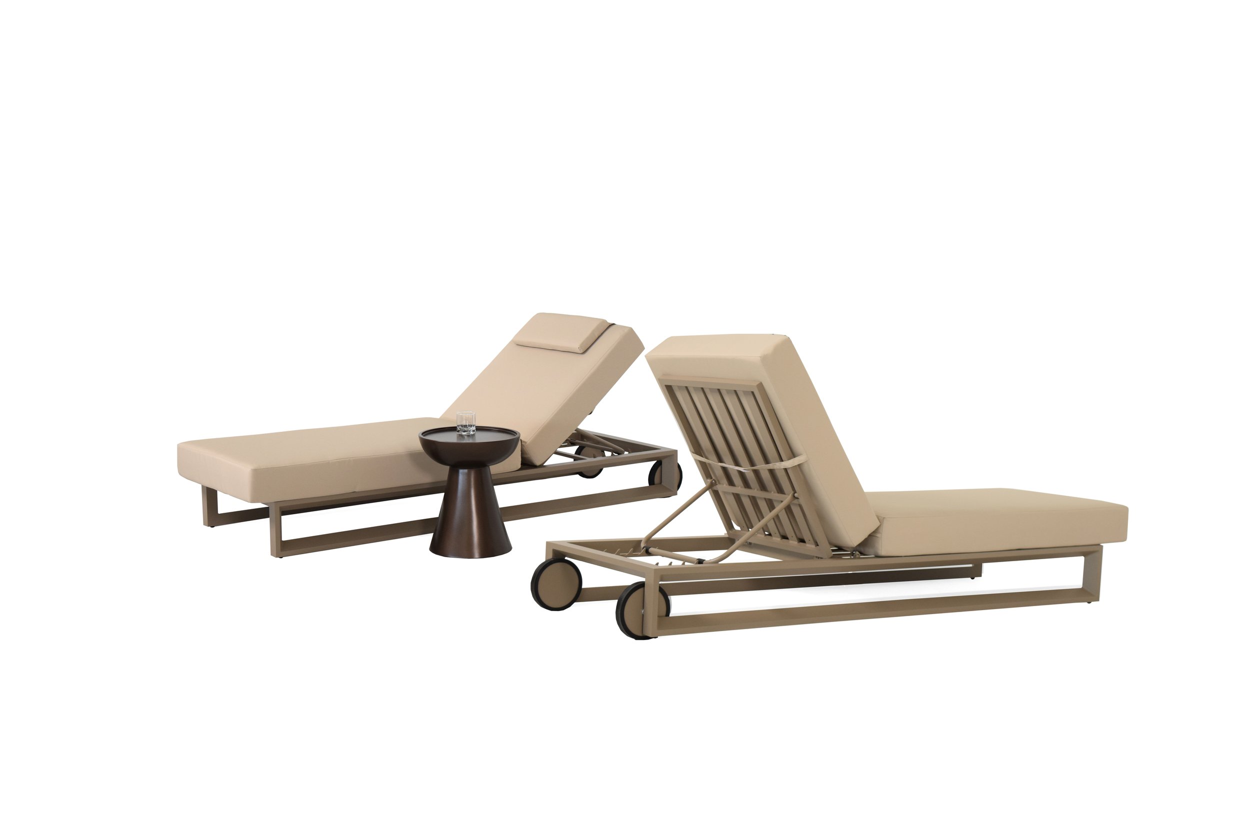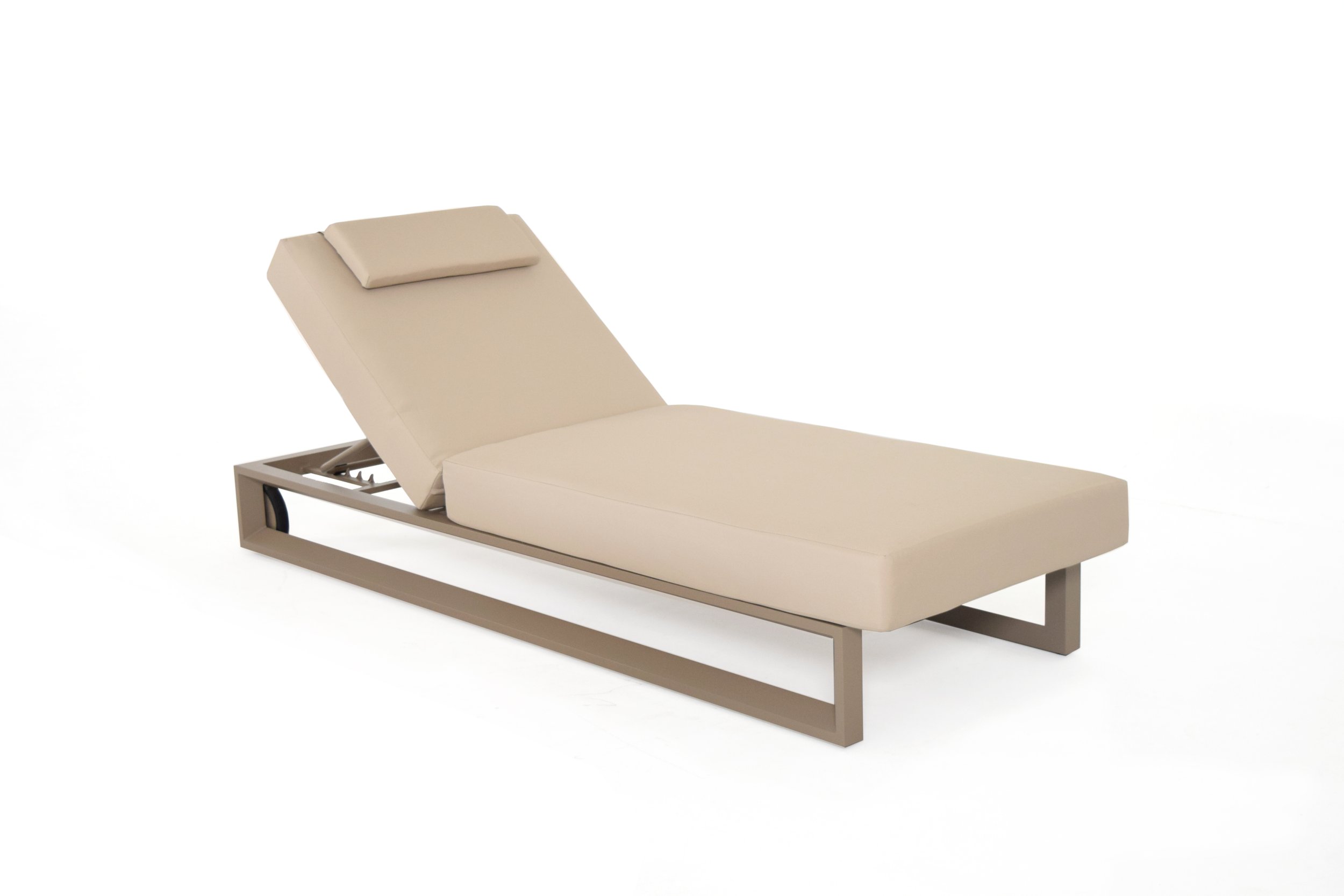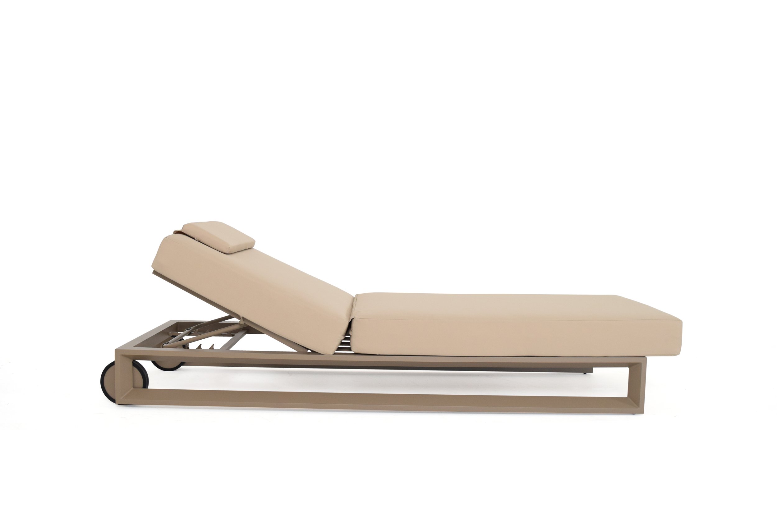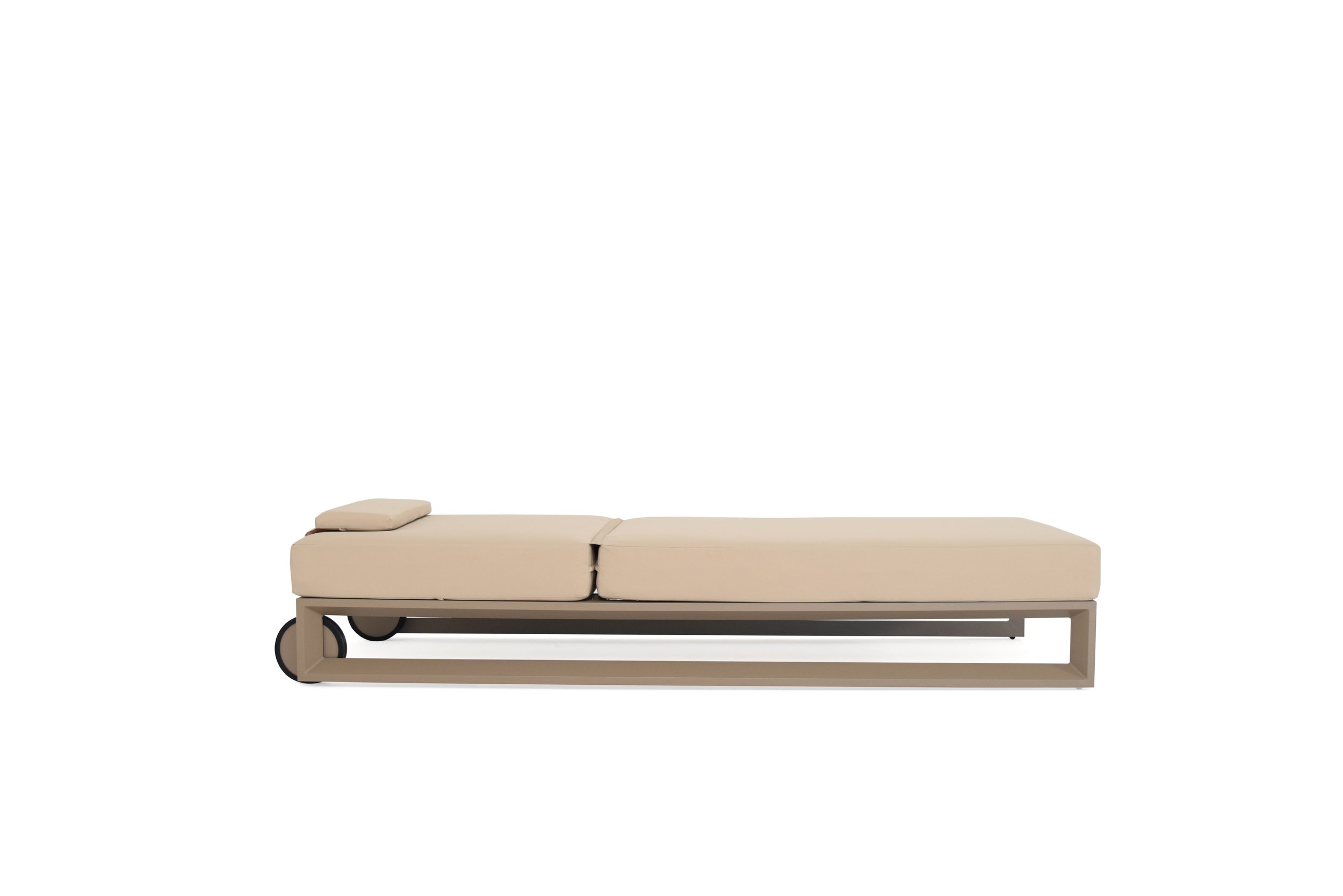 Bloom sunbed is designed for outdoor comfort and relaxation. It has three angles of inclination and can be easily moved. It is made with high-quality materials for outdoor use, with a aluminium structure and a generously sized mattress. The mattress is padded with polyurethane foam and covered with water-repellent fabric. The sunbed has a refined aesthetic and elegant details.