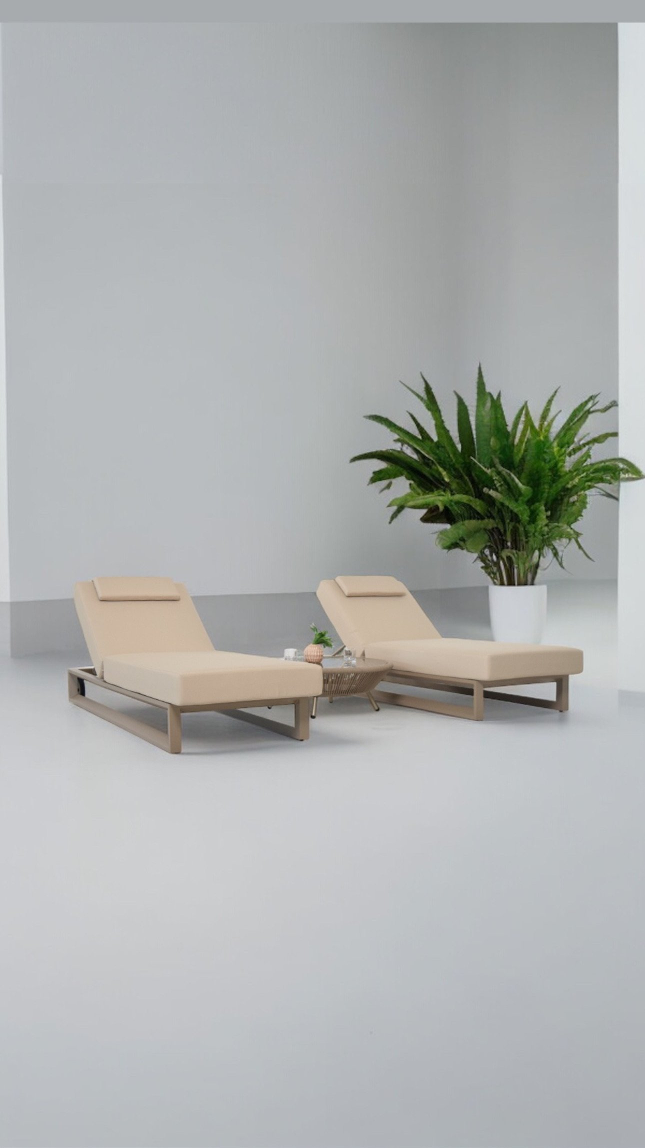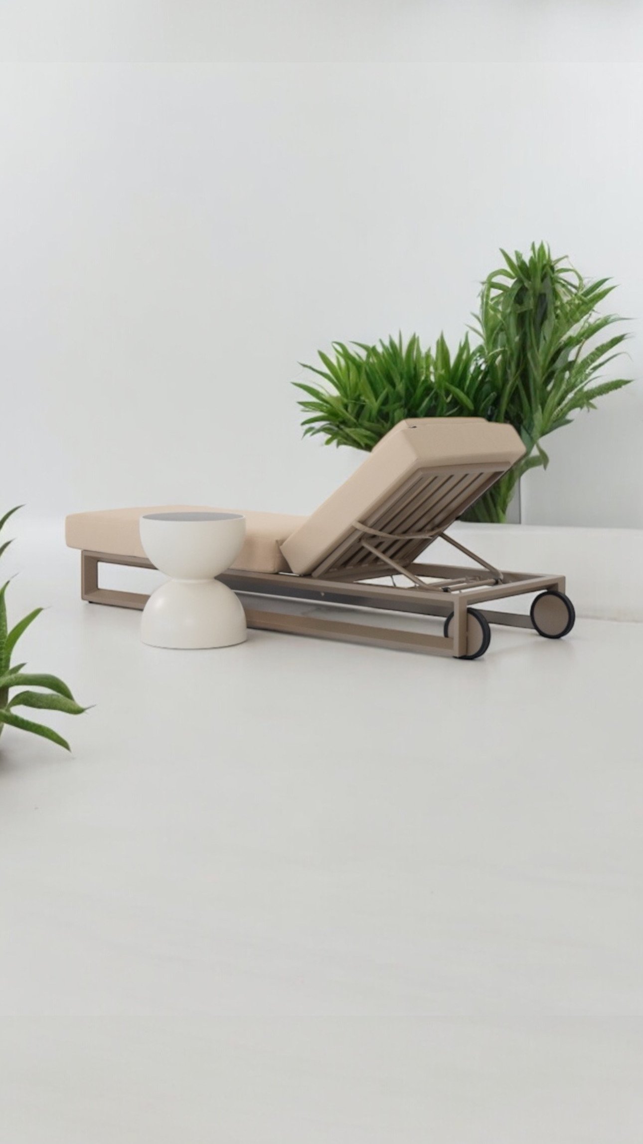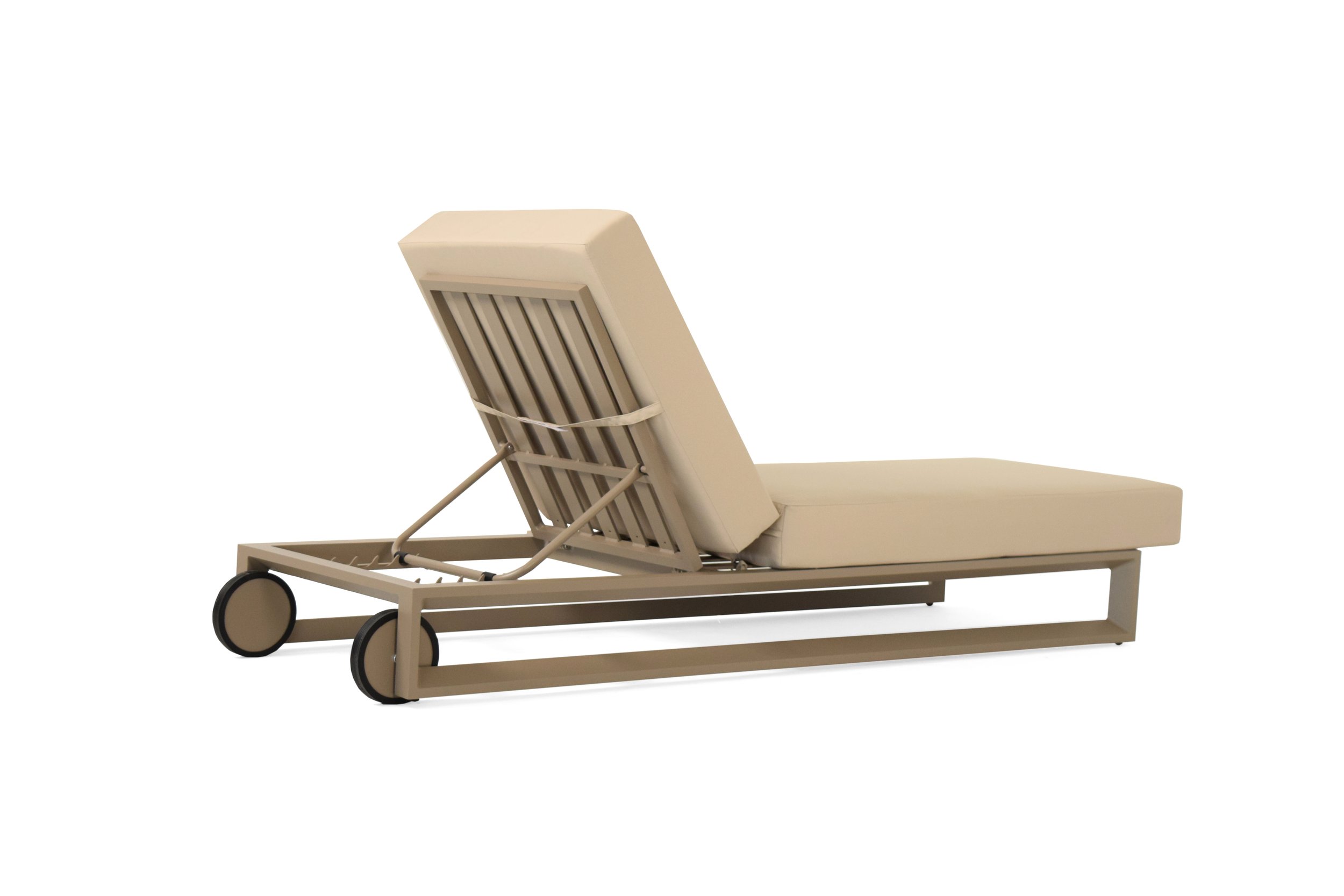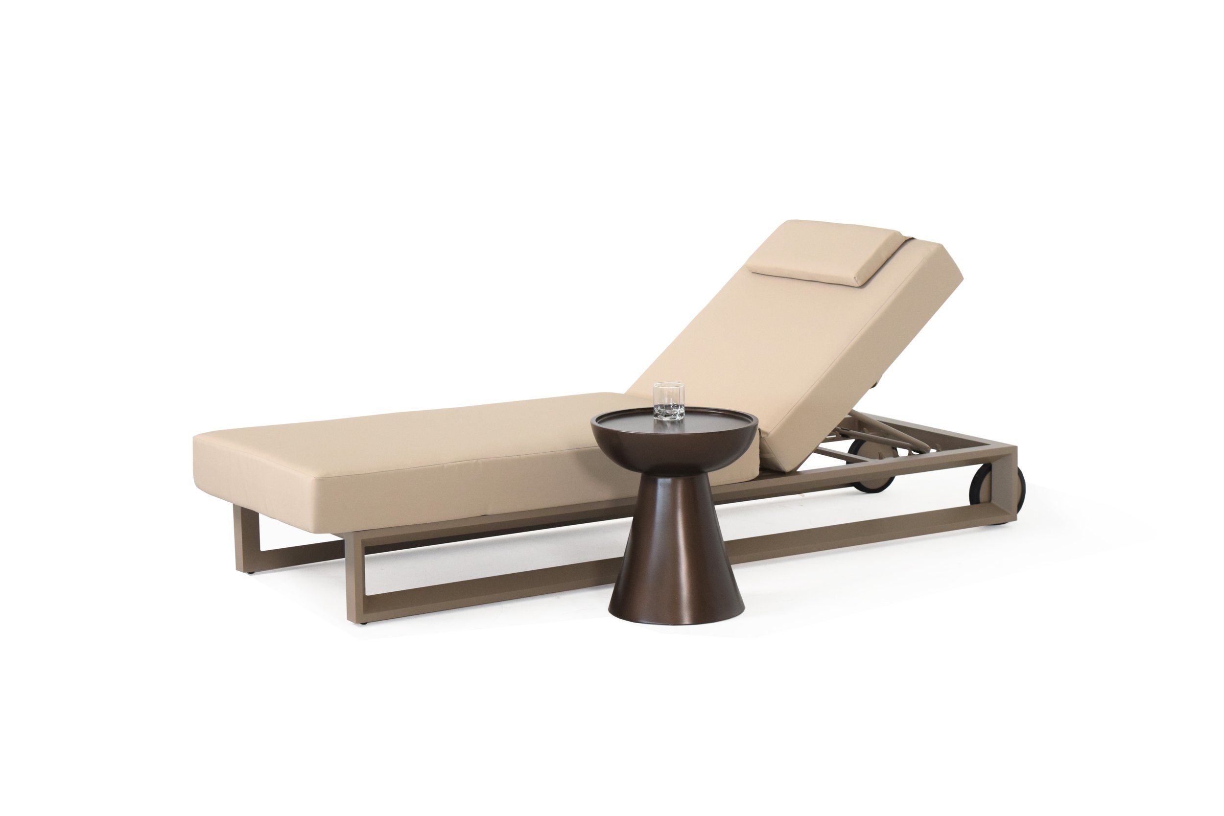 Bloom sunbed is designed for outdoor comfort and relaxation. It has three angles of inclination and can be easily moved. It is made with high-quality materials for outdoor use, with a aluminium structure and a generously sized mattress. The mattress is padded with polyurethane foam and covered with water-repellent fabric. The sunbed has a refined aesthetic and elegant details.