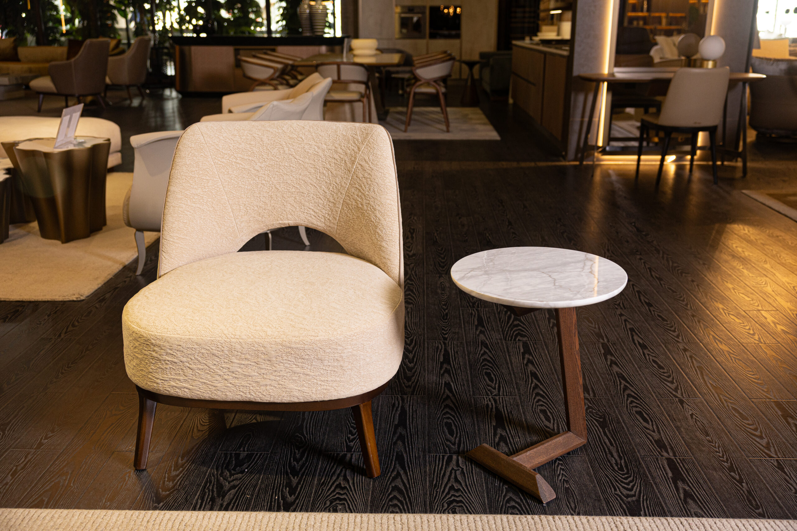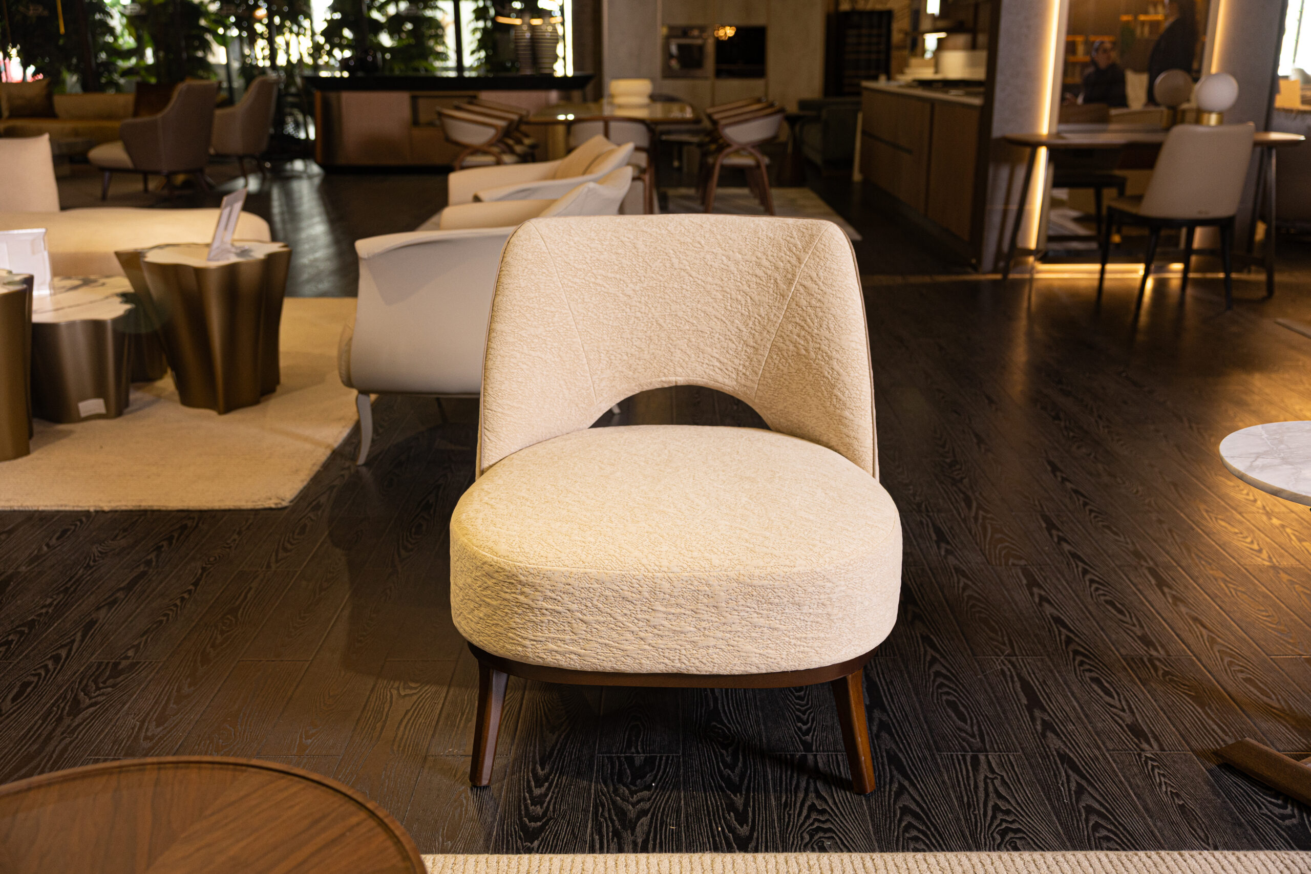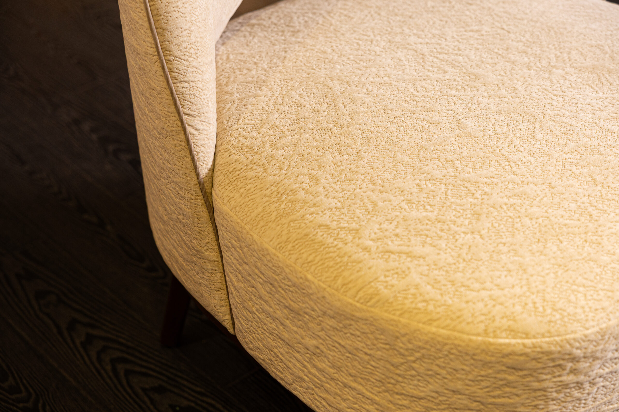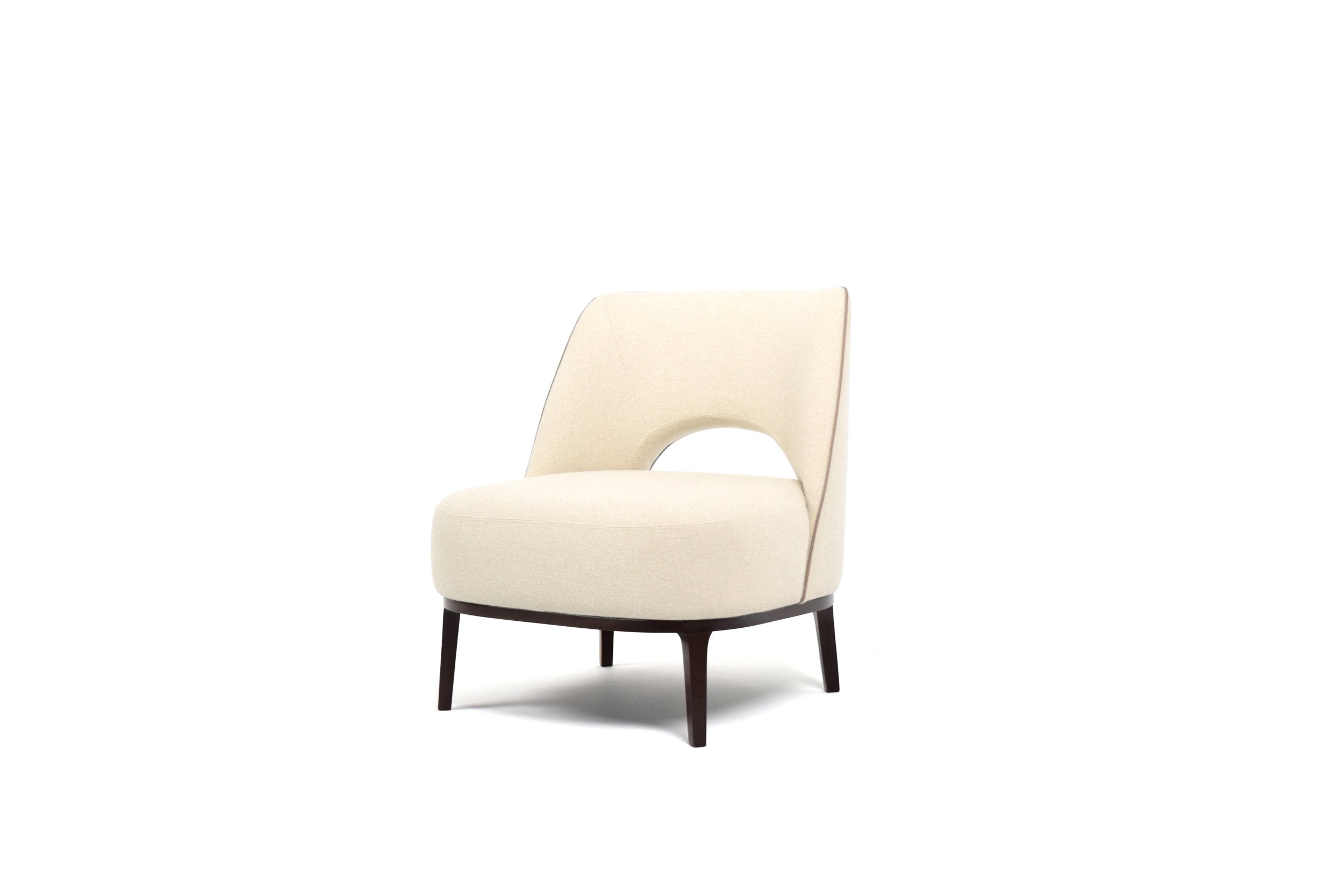 The Camille Armchair blends retro charm with modern elegance, featuring graceful lines and an enveloping seat back for comfort. Its sculpted opening adds an airy feel, while the base options of cast aluminum or solid wood provide sophistication. Built with a solid wood structure and multilayered wood panel, the armchair ensures durability. The flexible polyurethane foam and polyester fiber frame offer ergonomic support. Available in fabric or leather, Camille can be customized to match any decor. Ideal for both residential and commercial spaces, it combines timeless style with exceptional comfort, elevating any room it graces.