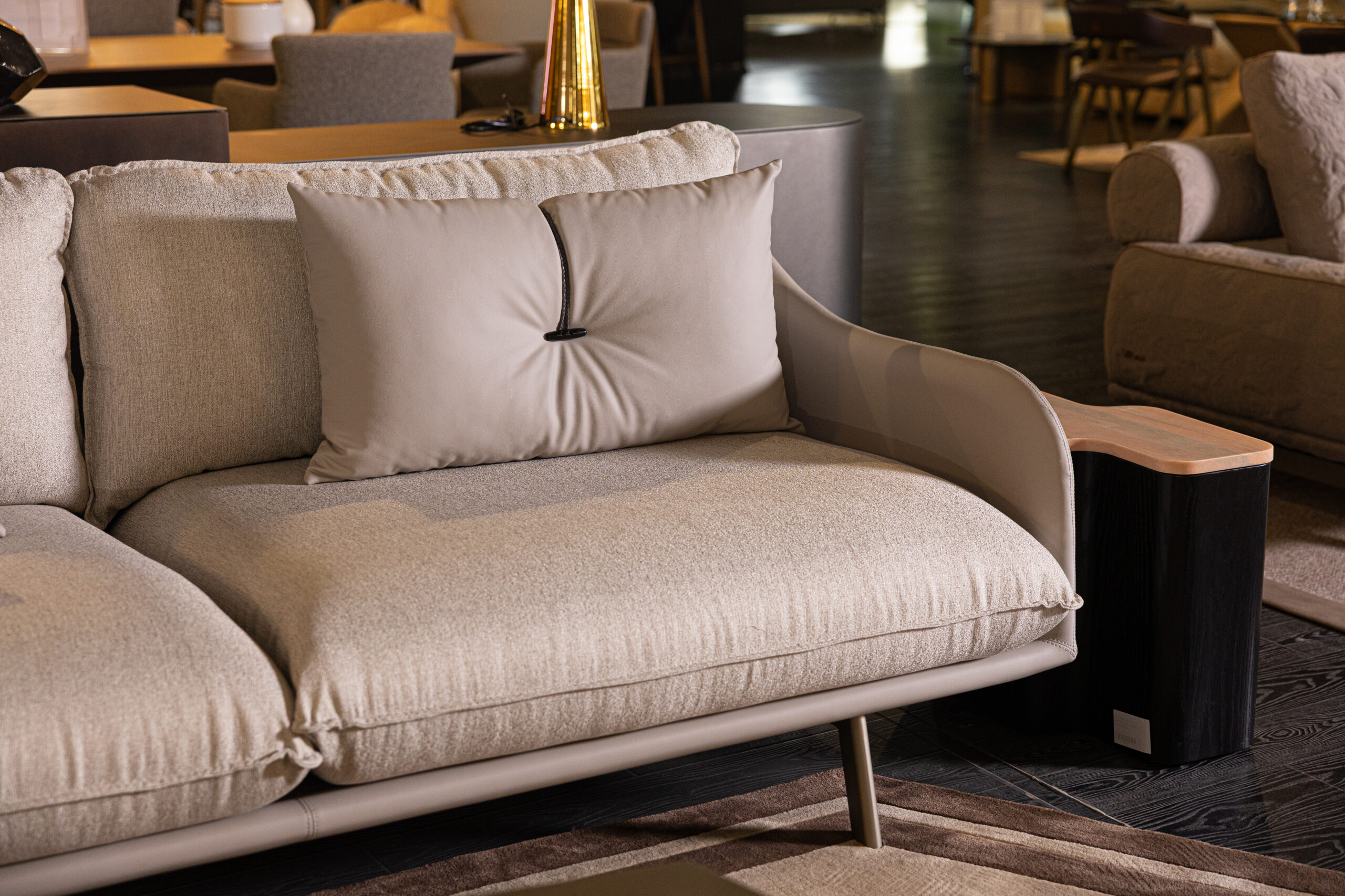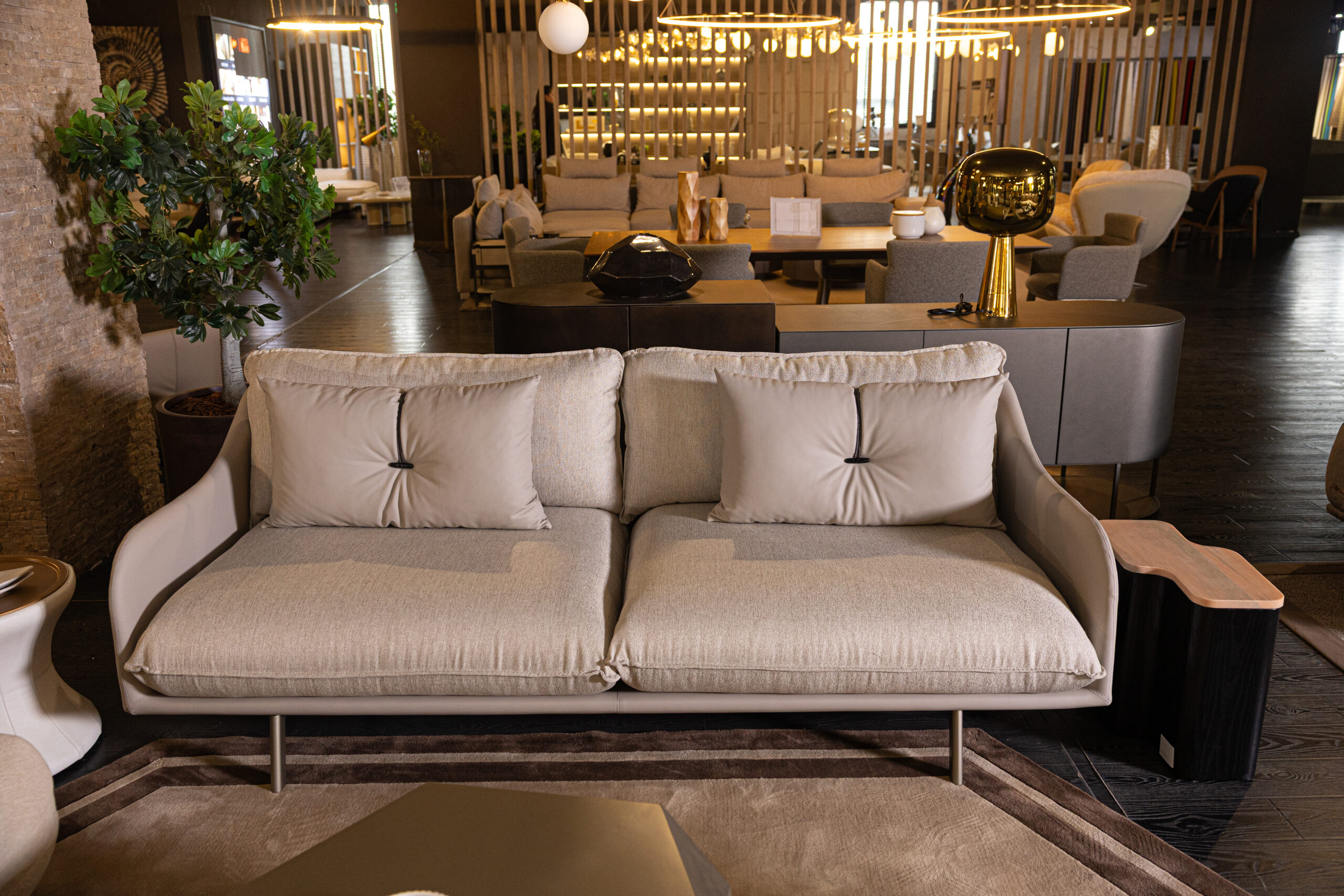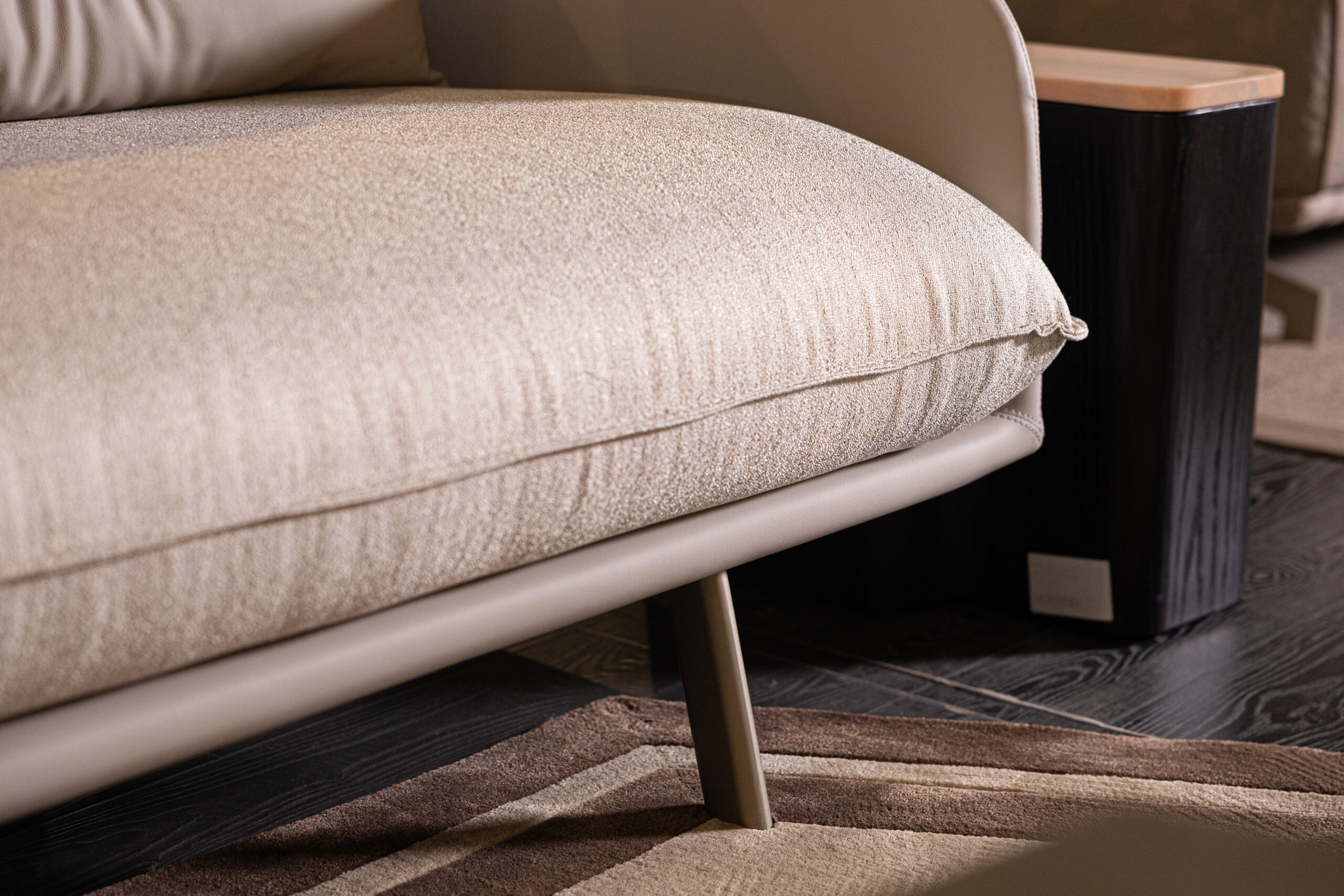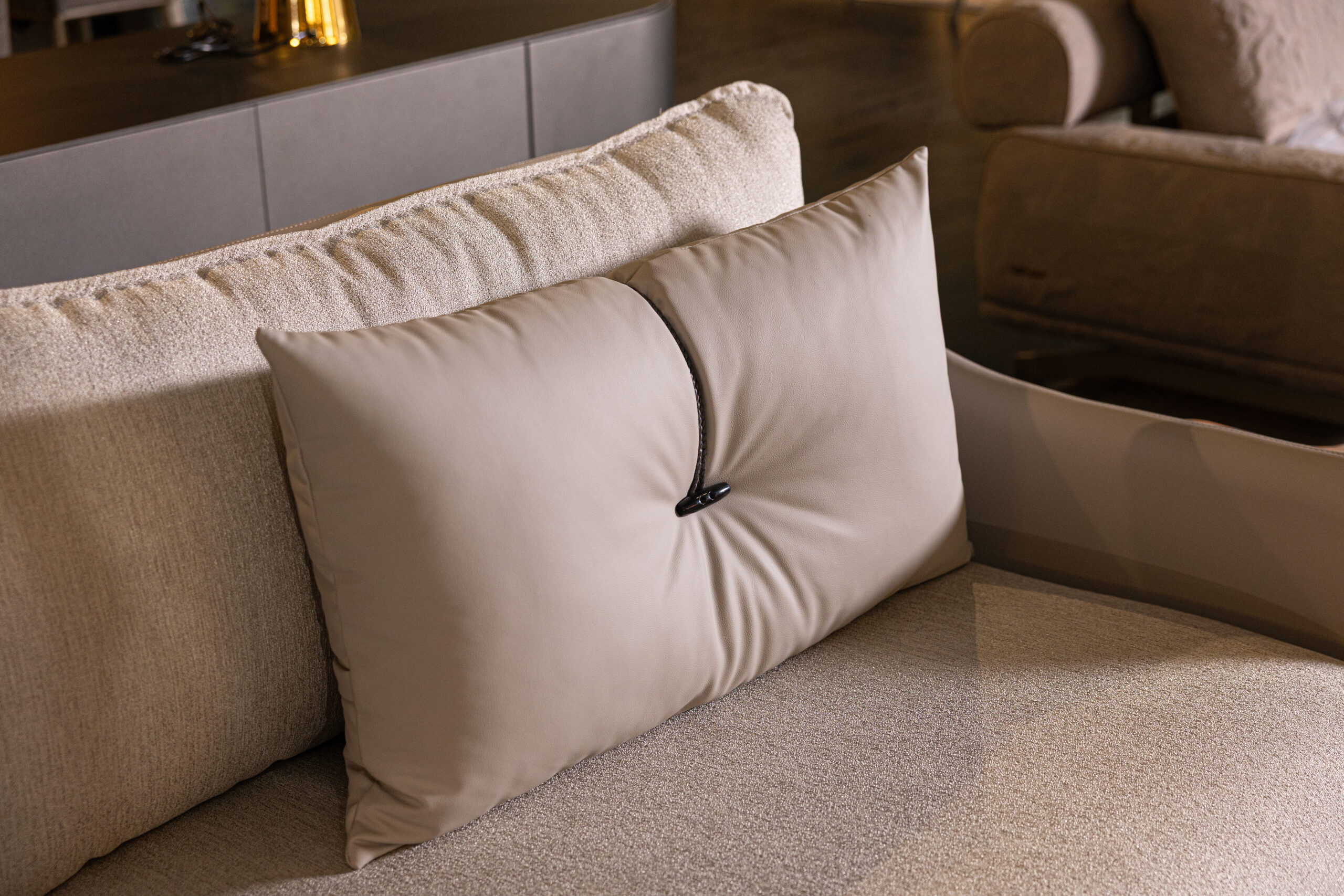 EVELYNN is a luxurious 3-seater sofa that combines timeless design with ultimate comfort. Its curved angles, round seat and back cushions, and intricately woven leather rope detail on the throw pillows exude elegance. Built on a sturdy multilayered wood panel structure with flexible polyurethane foam, EVELYNN ensures durability and superior comfort. The shaped polyurethane seat cushions offer varying densities for a plush seating experience. Available in premium fabric or leather upholstery, with matching legs, it offers full customization. Designed by Riccardo Giovanetti, EVELYNN seamlessly blends contemporary style with classic charm, elevating any living space with sophistication and luxury.