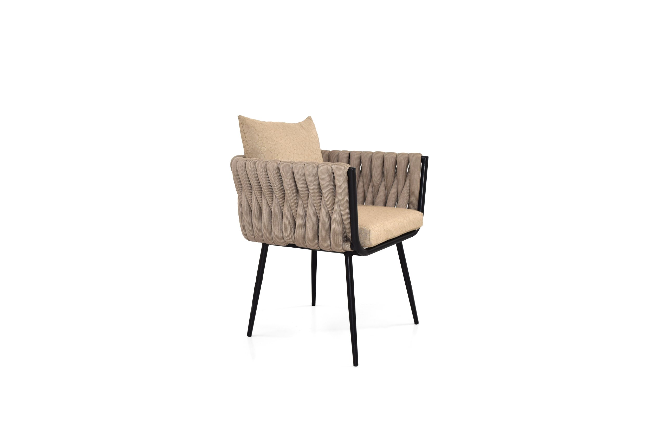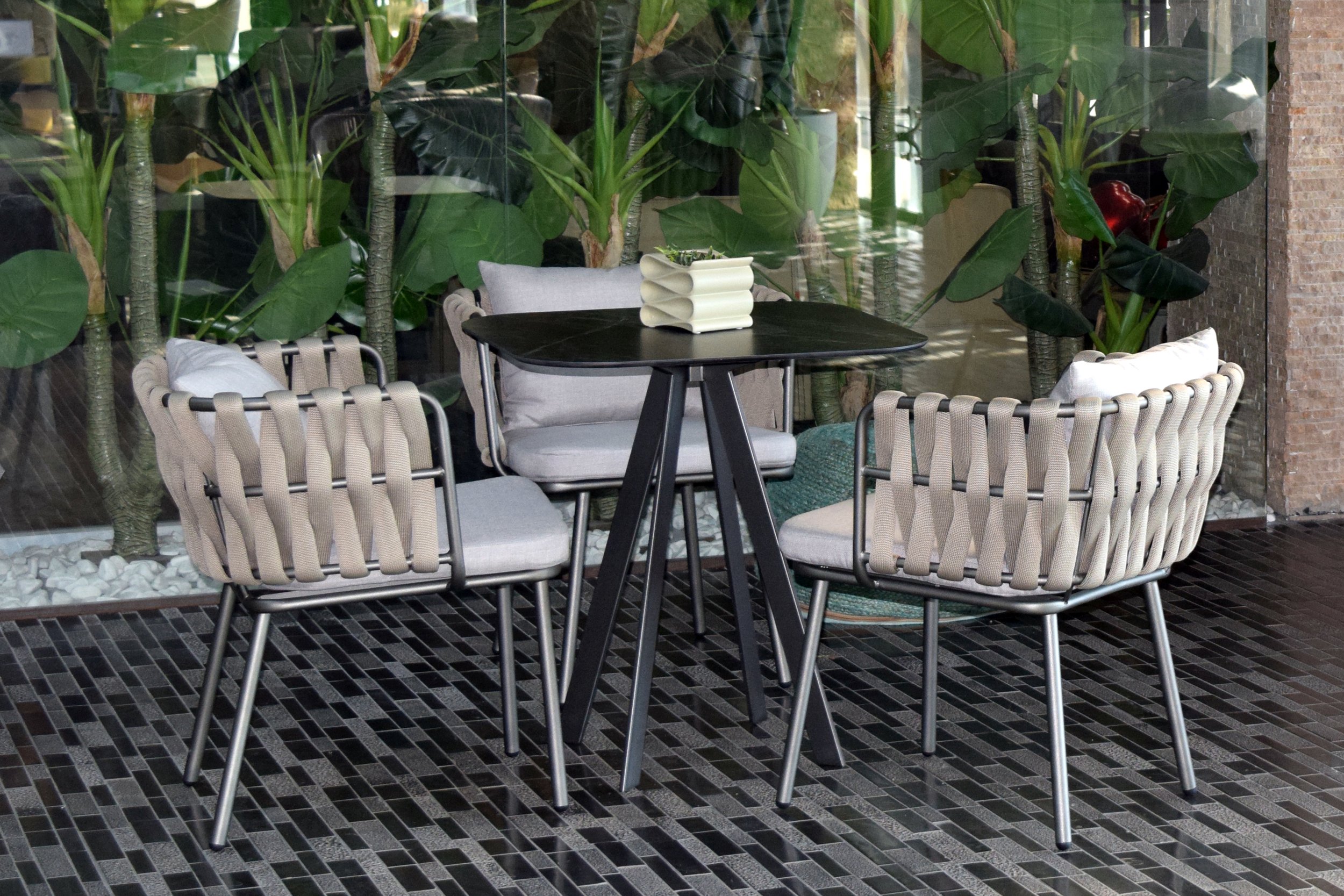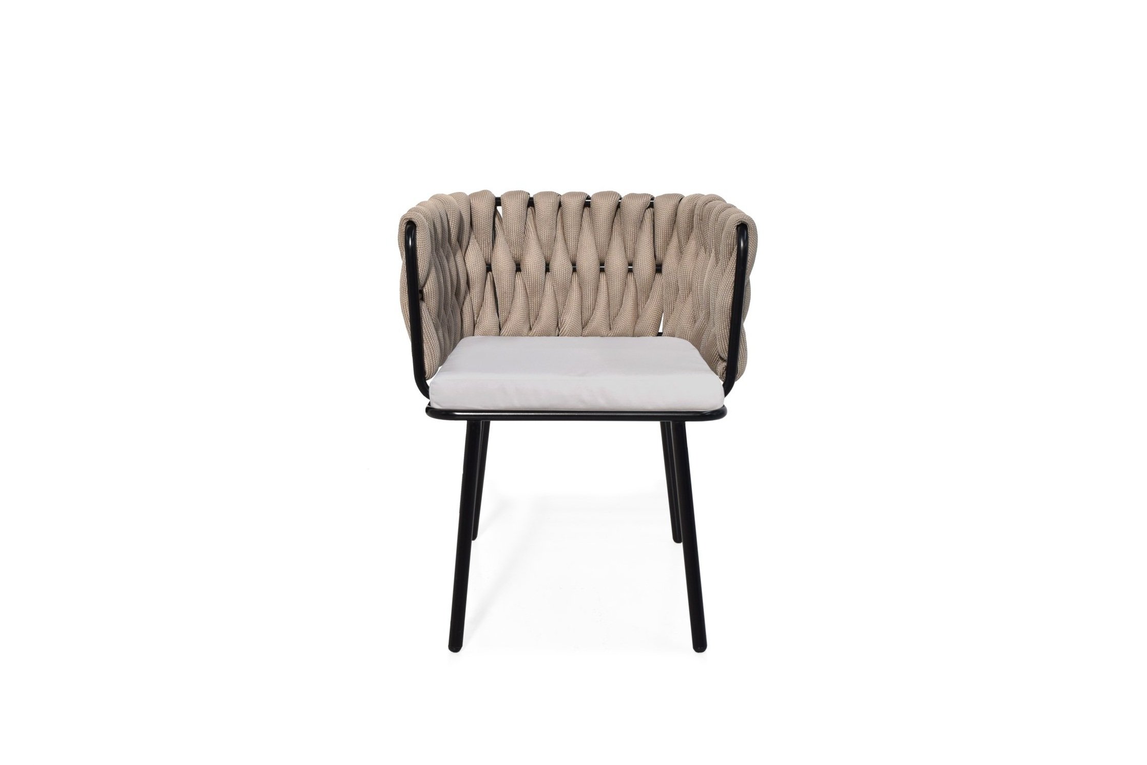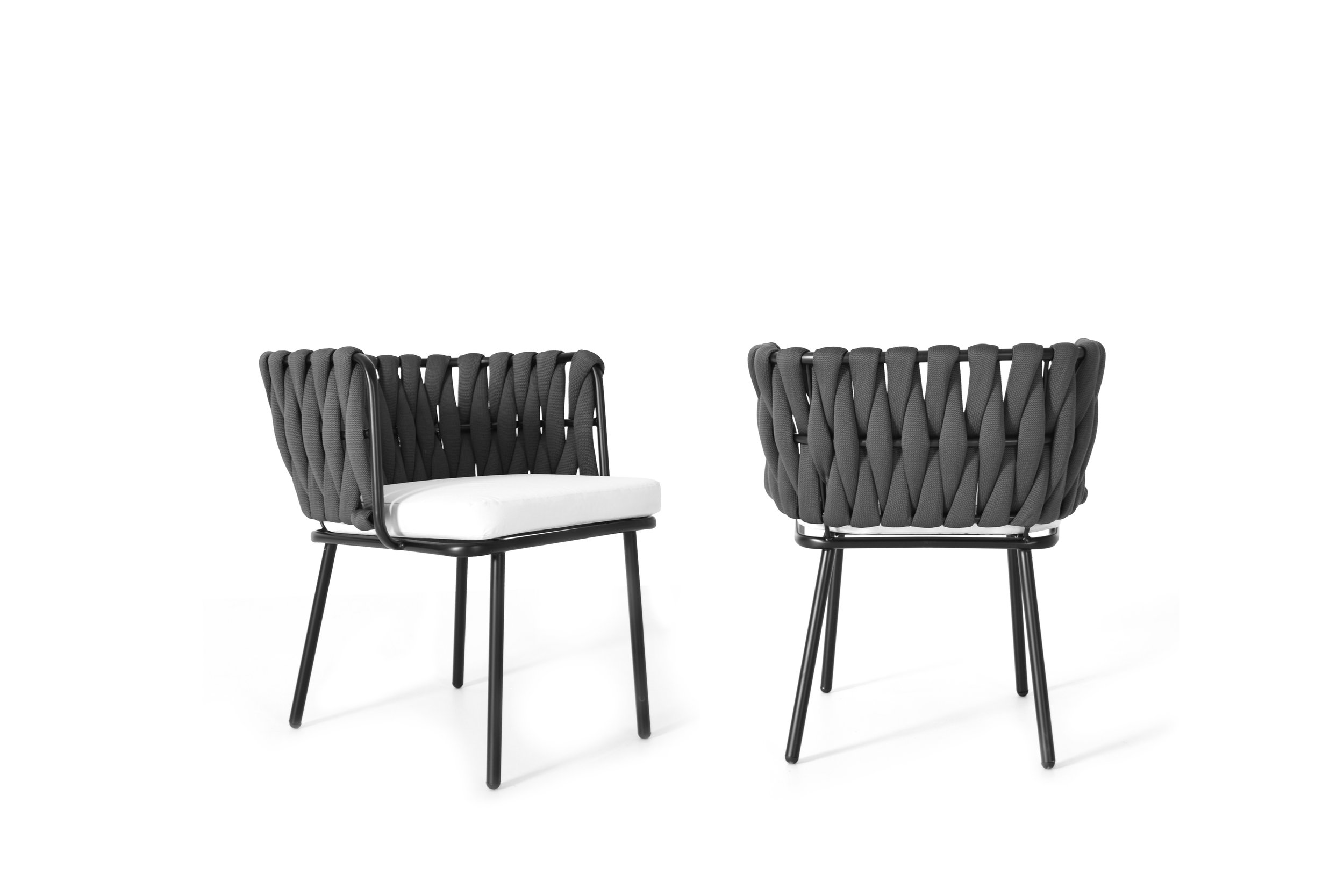 Felicity chairs are both warm and inviting, as well as elegant and interesting. A beautiful powder-coated stainless steel sitting shell is upholstered with extra-large vertical braiding.The braiding material is truly innovative: foam mousse is enclosed in a continuous sheath of knitted textilene and polyolefine, making the material both weather- resistant and pleasantly soft to the touch. The outside cushions make for a very comfortable seating experience.