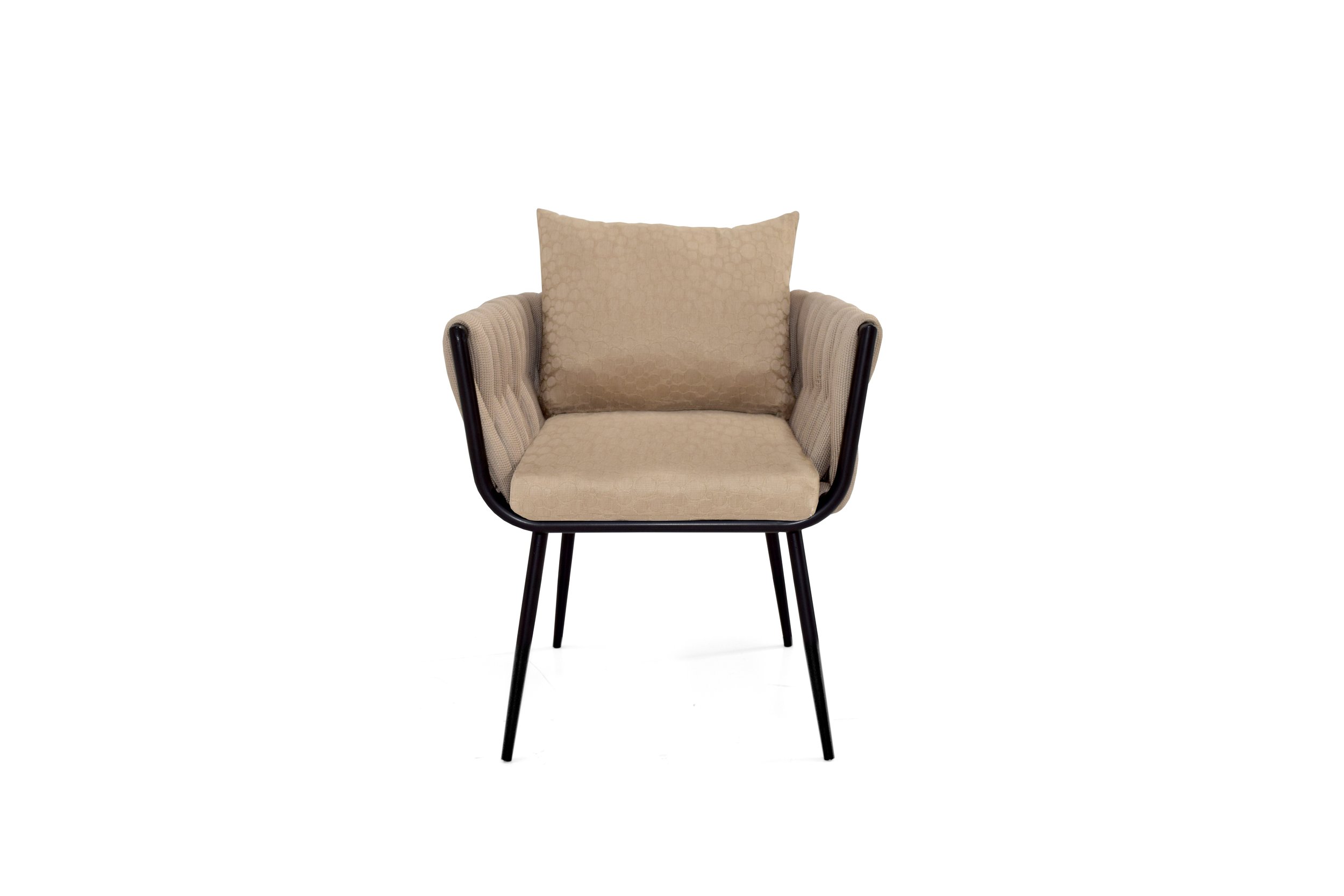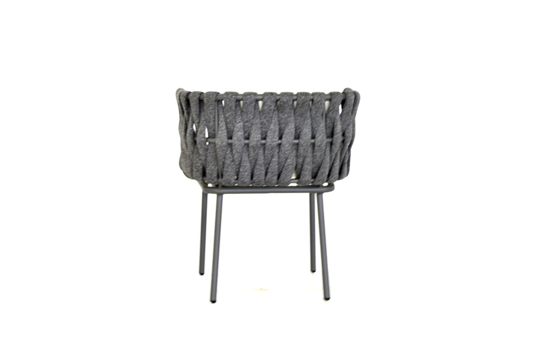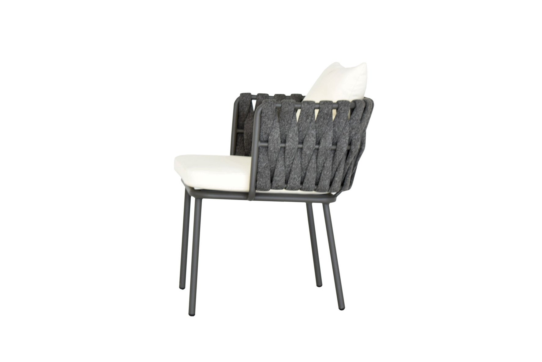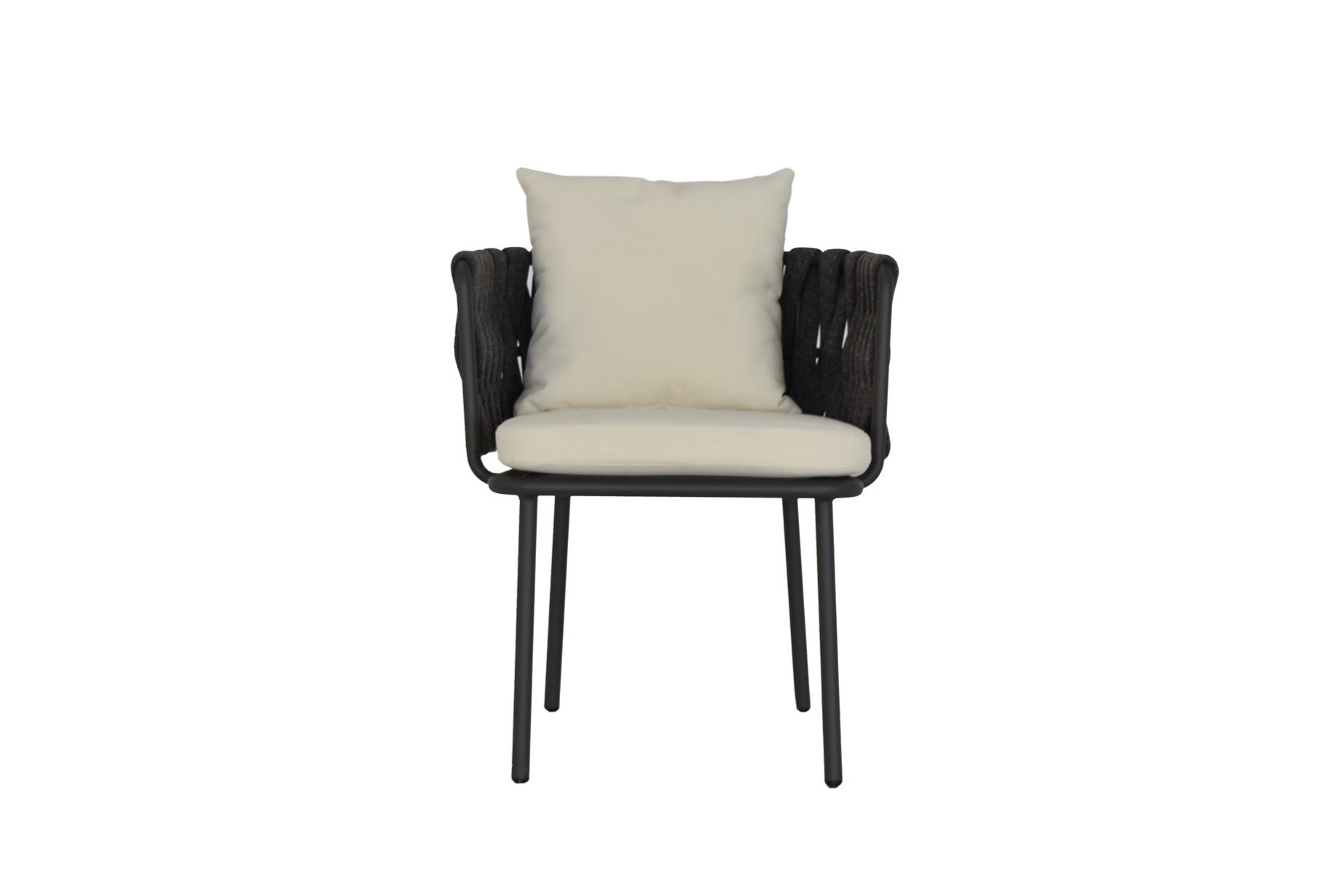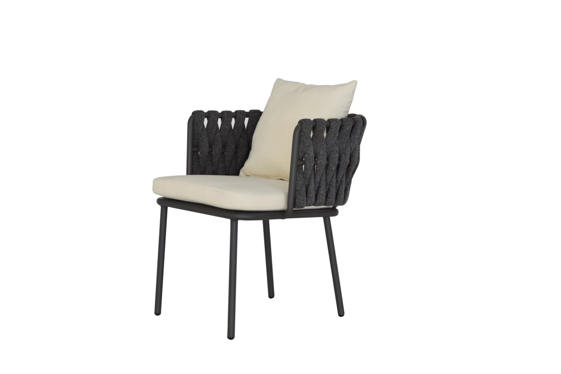 Felicity chairs are both warm and inviting, as well as elegant and interesting. A beautiful powder-coated stainless steel sitting shell is upholstered with extra-large vertical braiding.The braiding material is truly innovative: foam mousse is enclosed in a continuous sheath of knitted textilene and polyolefine, making the material both weather- resistant and pleasantly soft to the touch. The outside cushions make for a very comfortable seating experience.