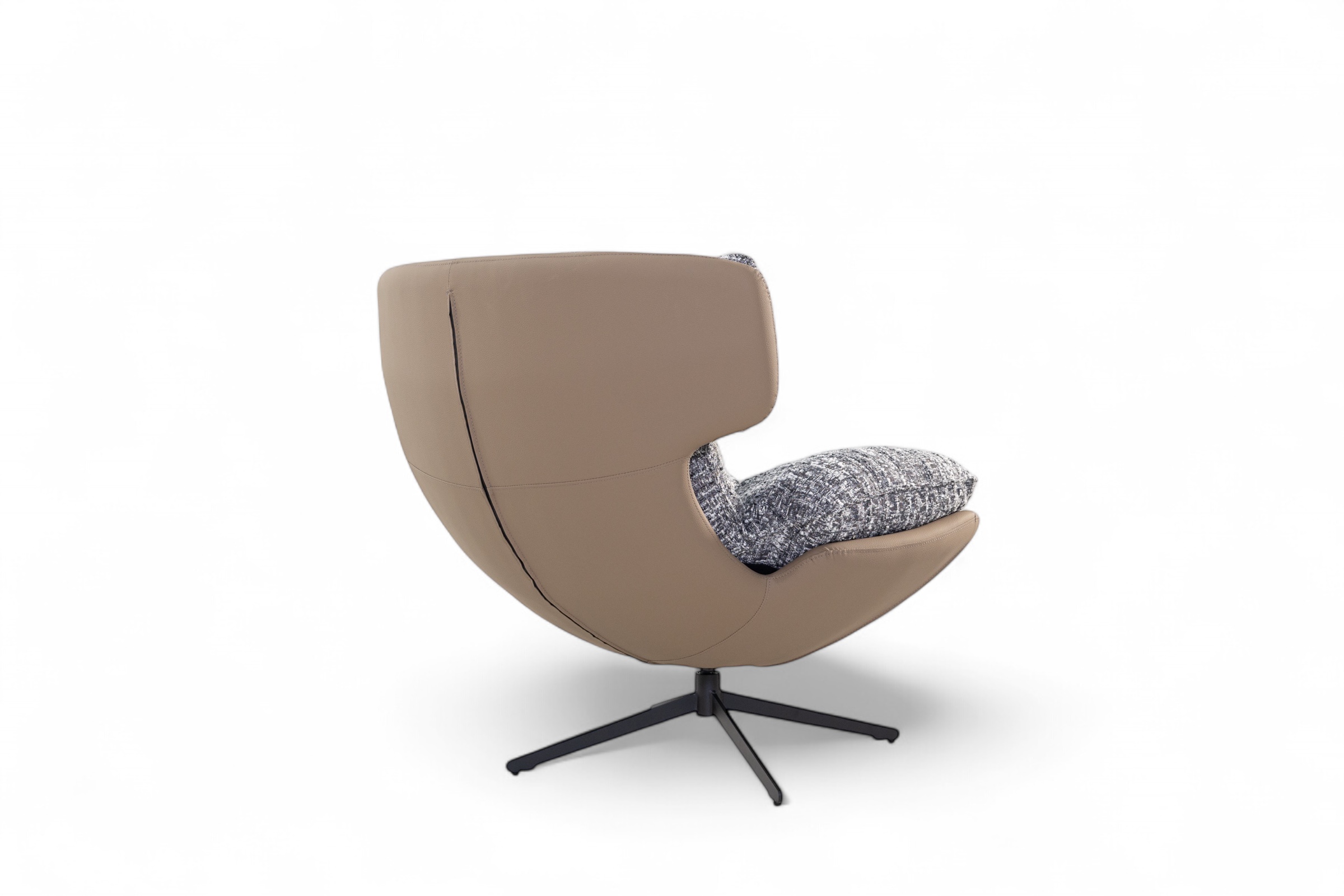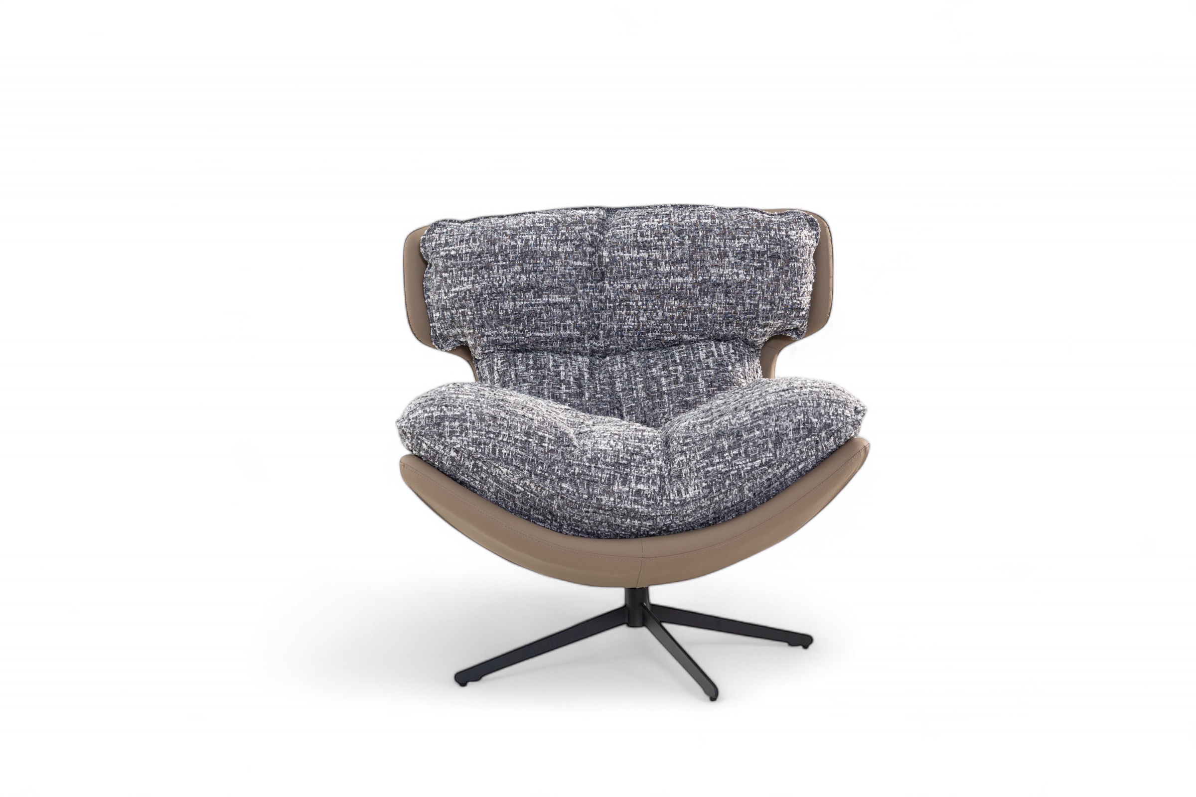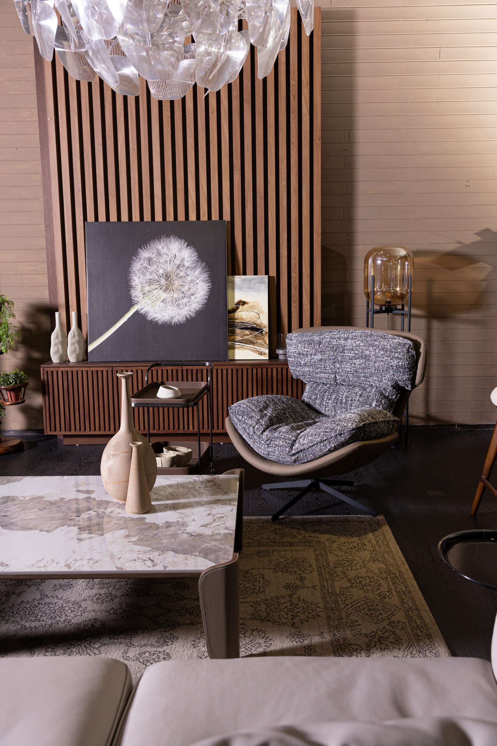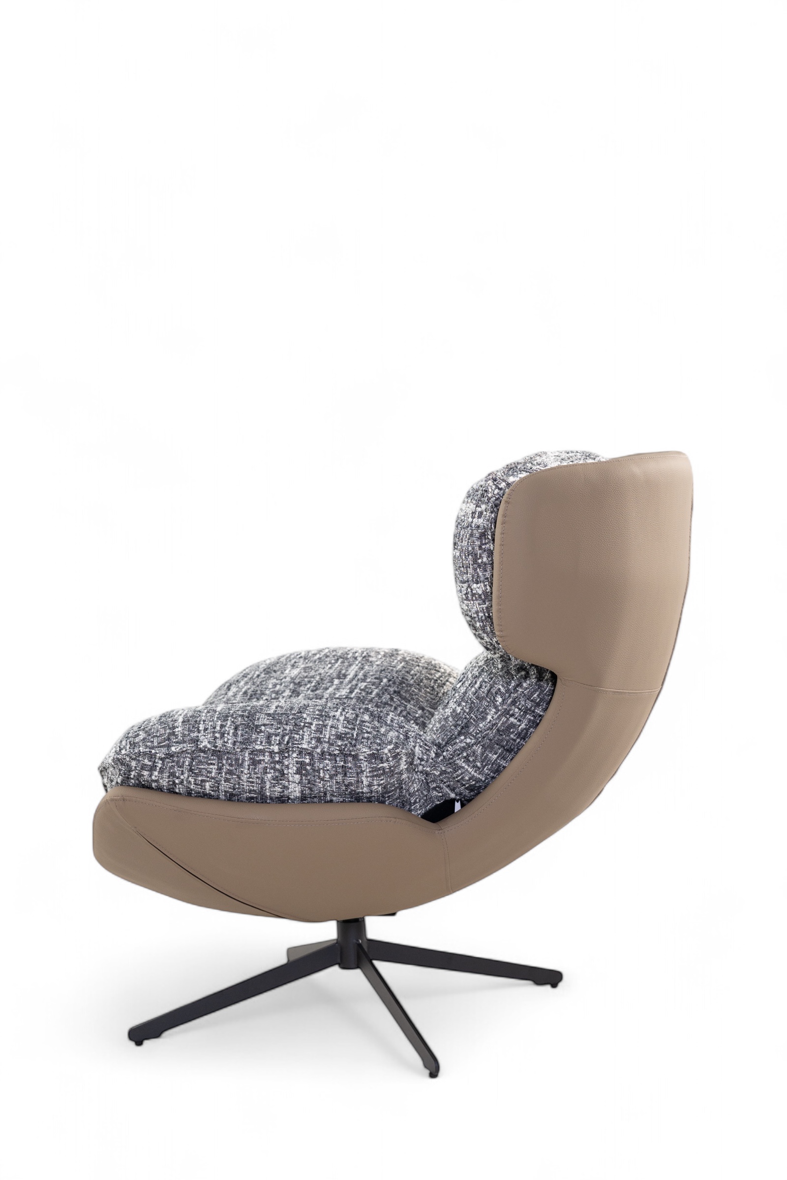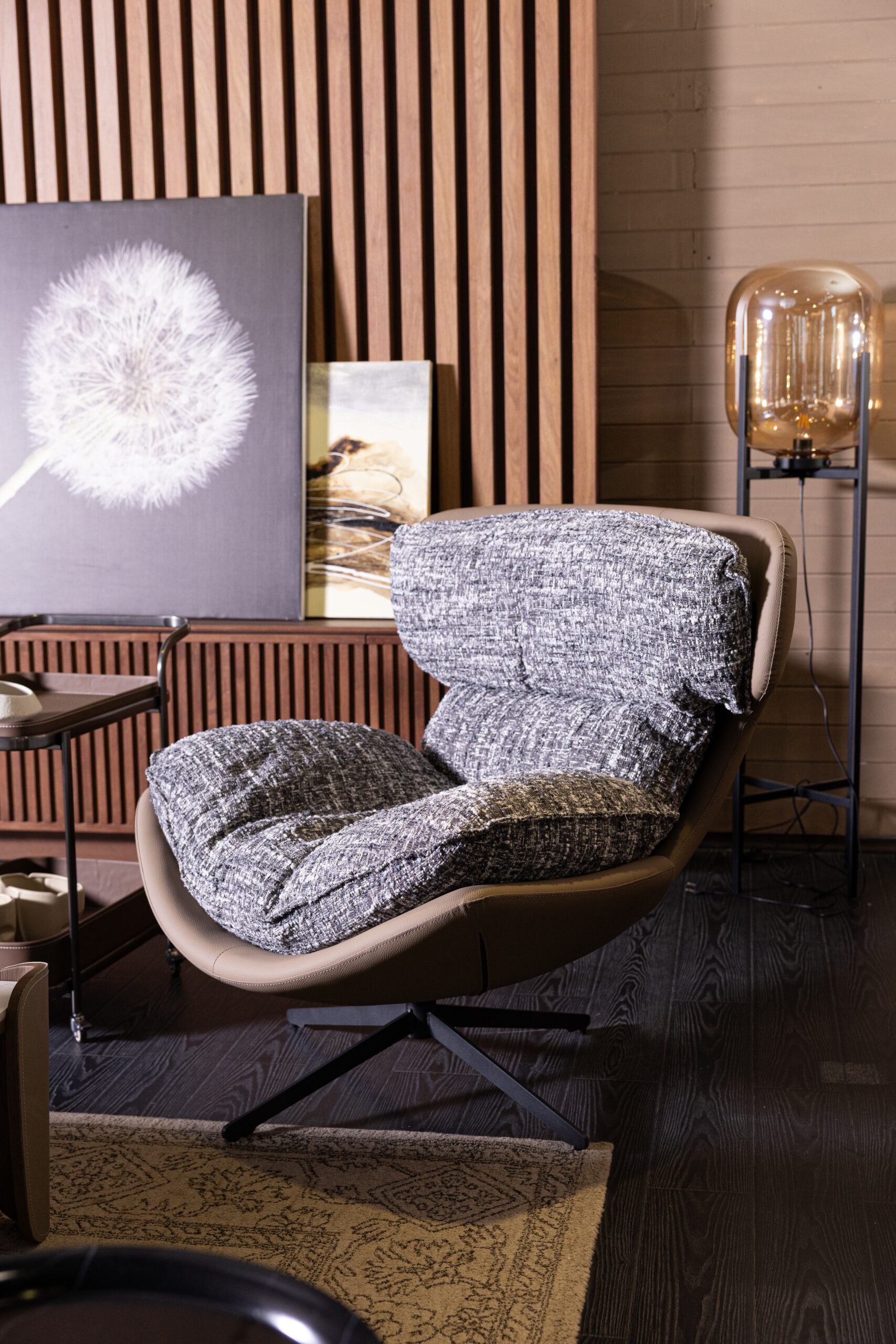 Fiorenza armchair embodies contemporary elegance with its sculptural form and inviting proportions. The generously cushioned seat and backrest, upholstered in a richly textured fabric, offer a tactile contrast to the sleek leather frame that gently embraces the structure. Its organic curves are supported by slender, minimalist legs, giving the piece a sense of lightness despite its plush volume. Both refined and comfortable, it creates an atmosphere of understated luxury, perfectly suited for moments of relaxation in a sophisticated interior. Designed with meticulous craftsmanship, this chair is a statement of modern refinement and enduring comfort.