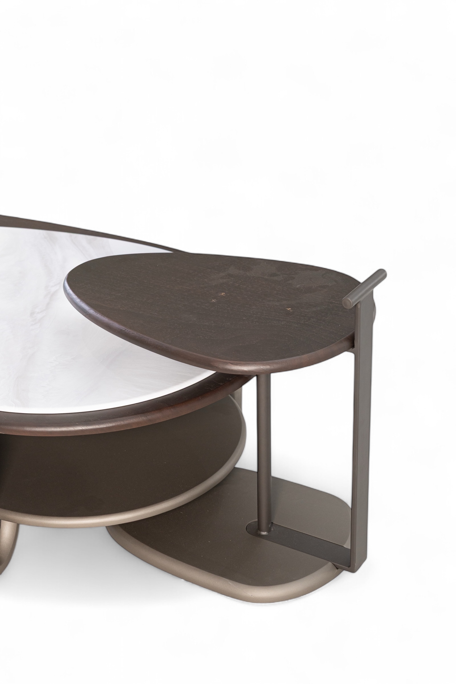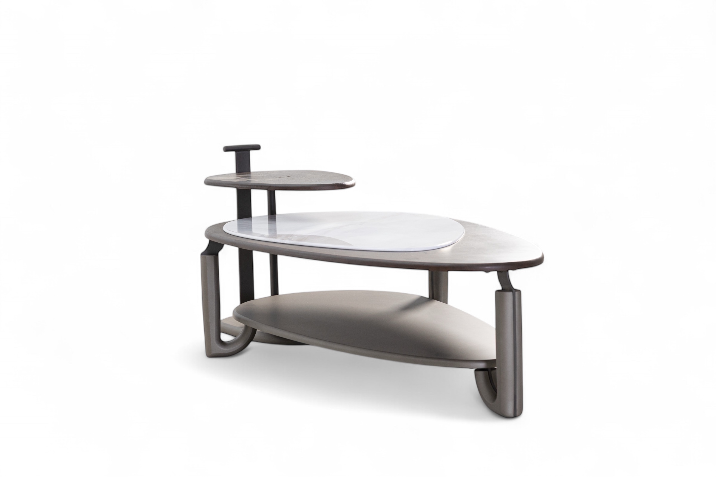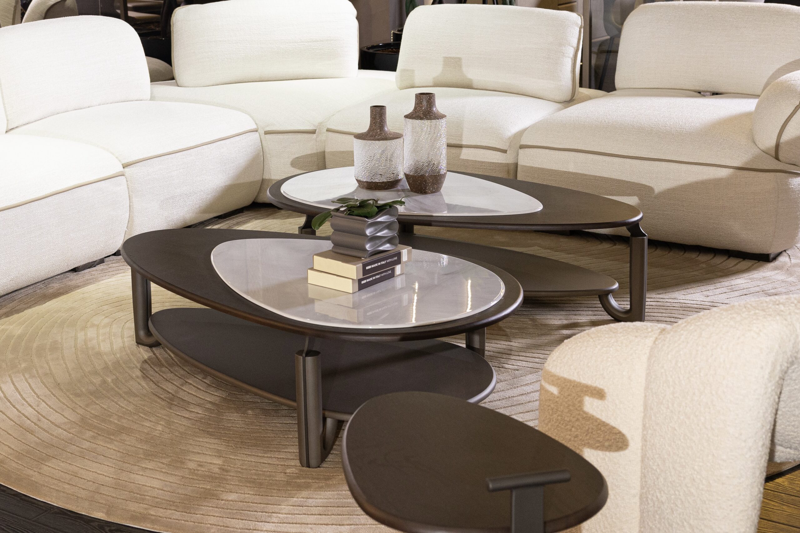The infinity coffee table by Able showcases a graceful interplay of textures and forms, blending modern artistry with refined functionality. The central surface, reminiscent of polished stone with delicate veining, is encased in a smooth wooden frame that softens its bold presence. A sculptural side platform rises elegantly, offering both visual balance and versatile use. Its organic lines and layered composition create a sense of movement, making it as much a design statement as a functional piece. Perfect for sophisticated interiors, it embodies understated luxury with effortless poise.