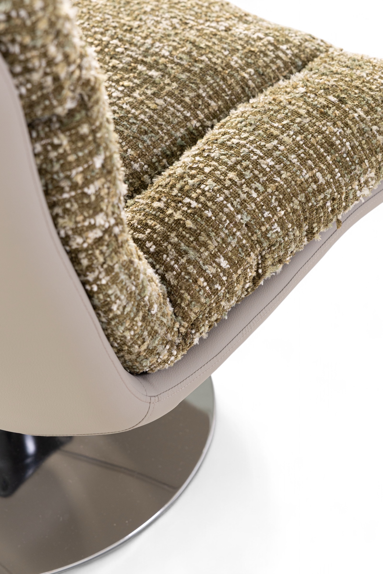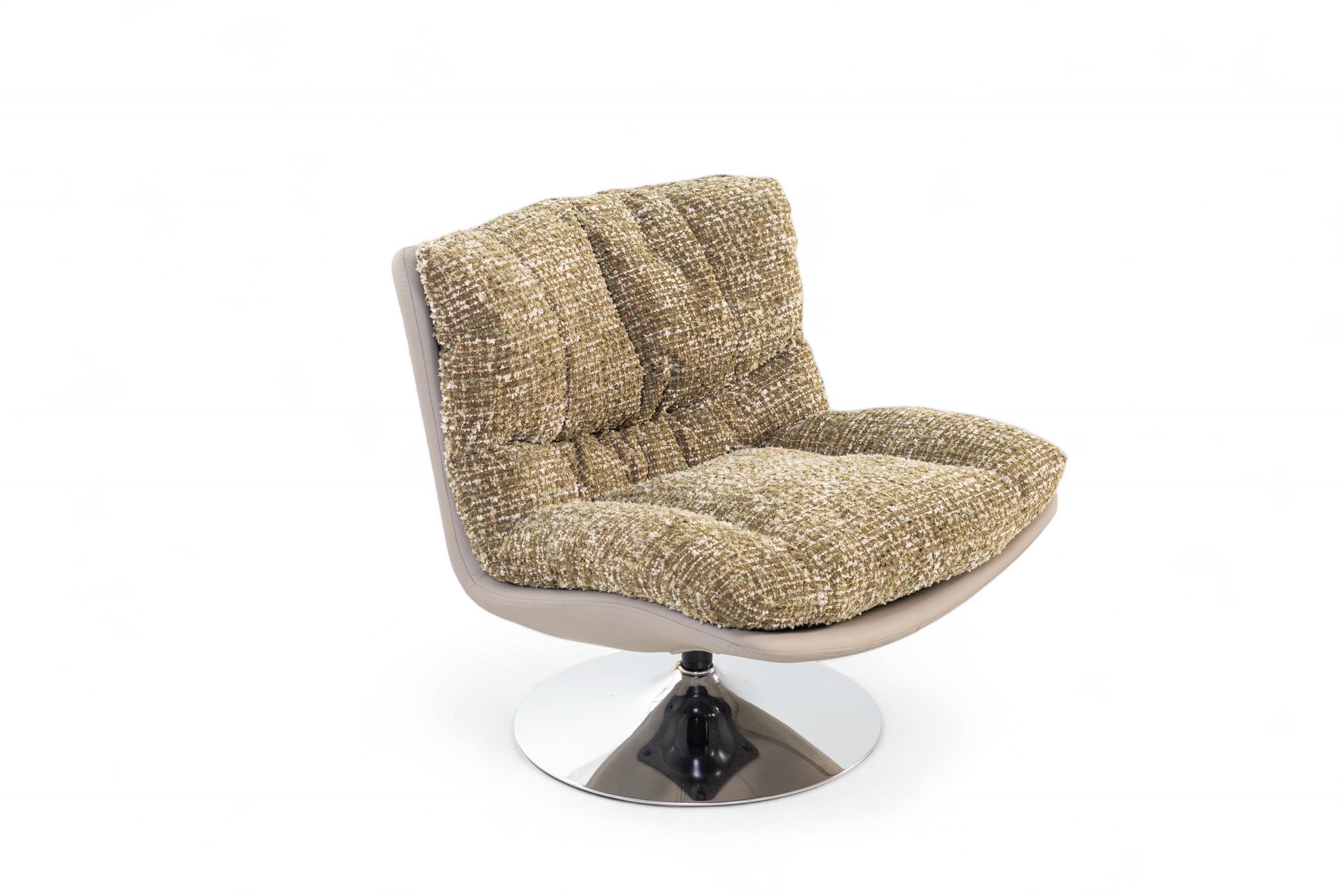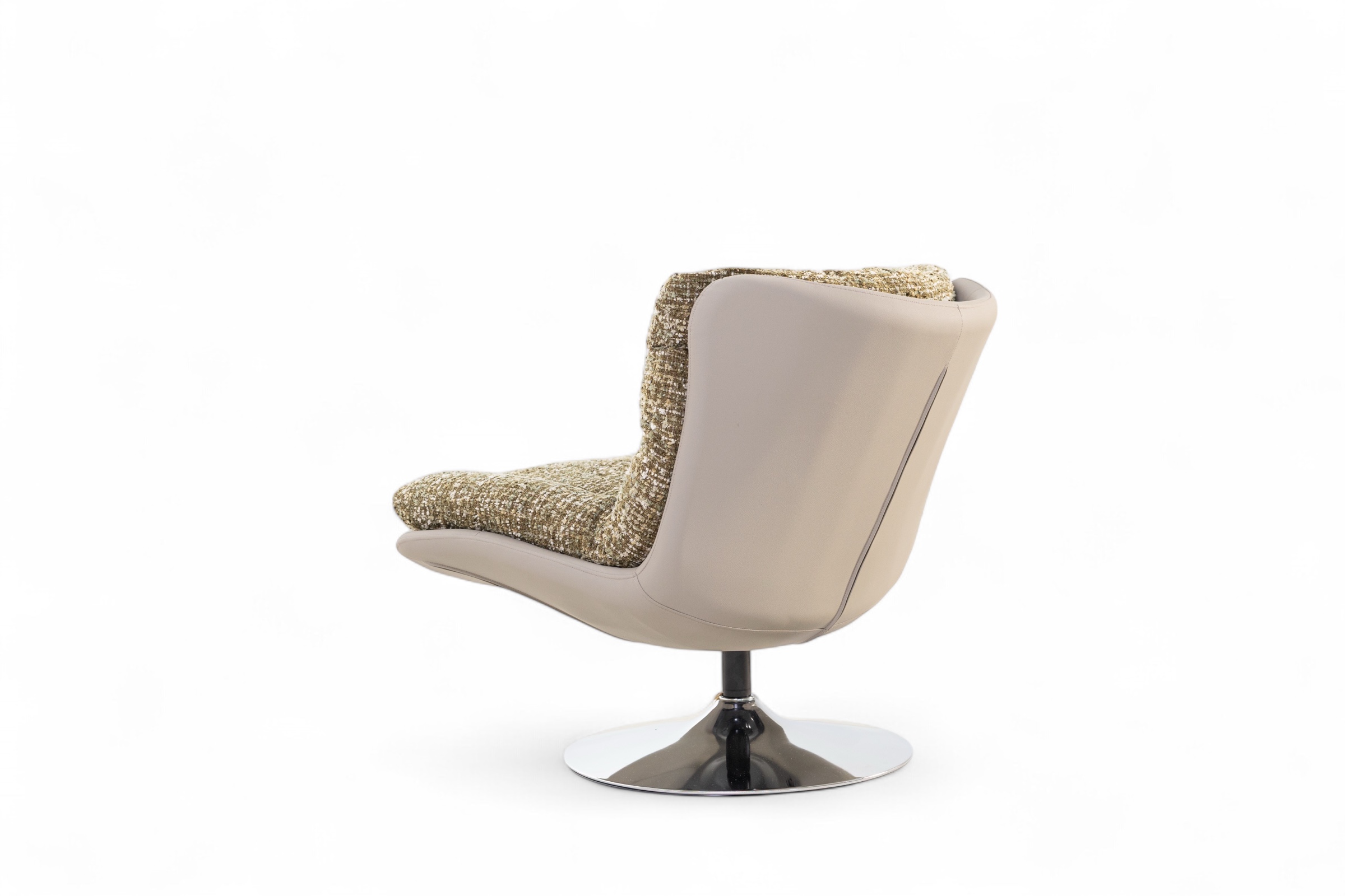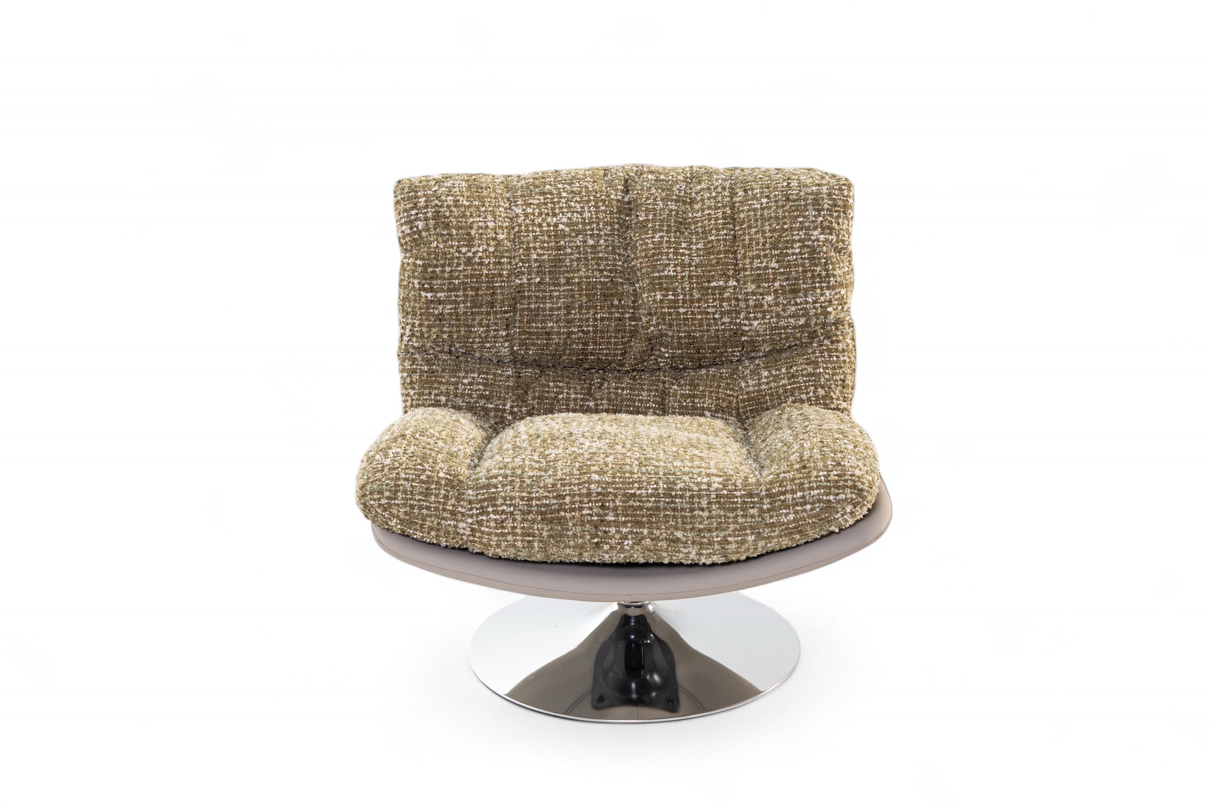 A harmonious blend of comfort and contemporary design, Joyce armchair exudes effortless sophistication. The sculptural silhouette is softened by its plush, textured upholstery—crafted in a tactile boucle-inspired fabric that invites touch and relaxation. Resting atop a polished, swirling base, the chair offers smooth 360-degree rotation, enhancing both its practicality and visual appeal. The enveloping backrest and generous cushioning create a sense of refined ease, ideal for both living and lounge spaces. A statement of modern craftsmanship, it seamlessly merges style, movement, and comfort into one inviting form.