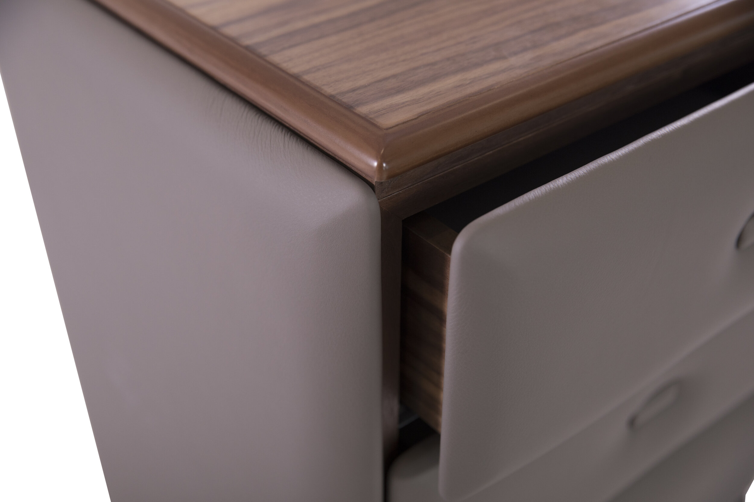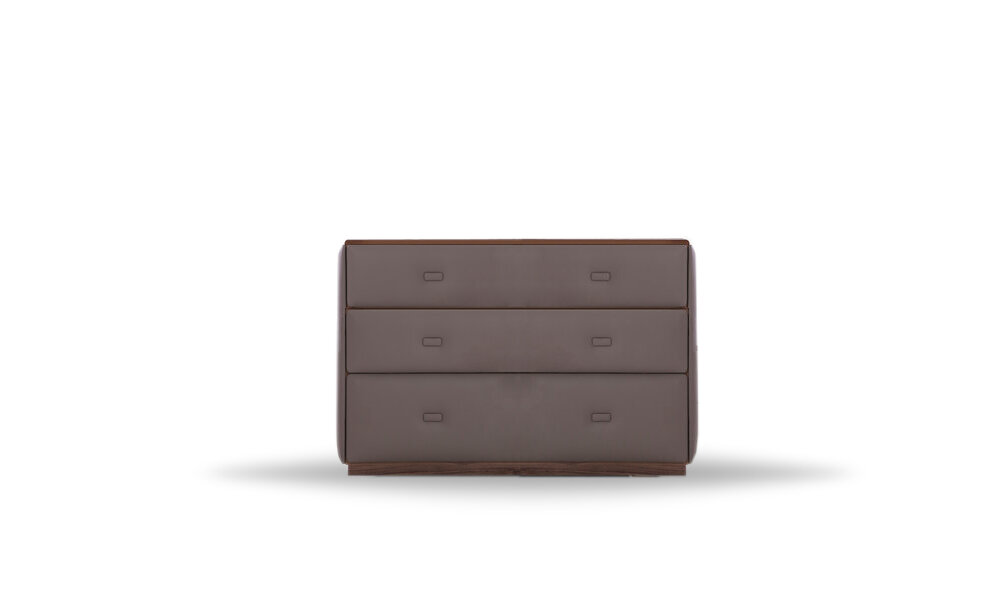 Finish: lacquered MDF fiber wood; Walnut veneer; Leather Exterior; fabric interior drawer base