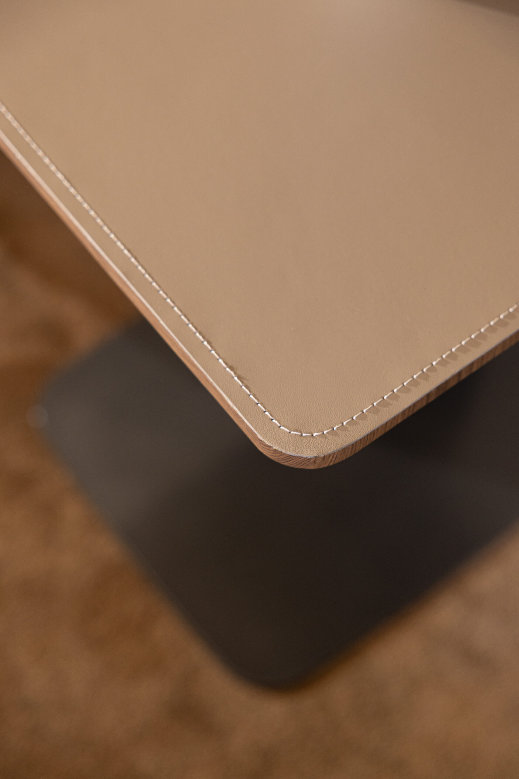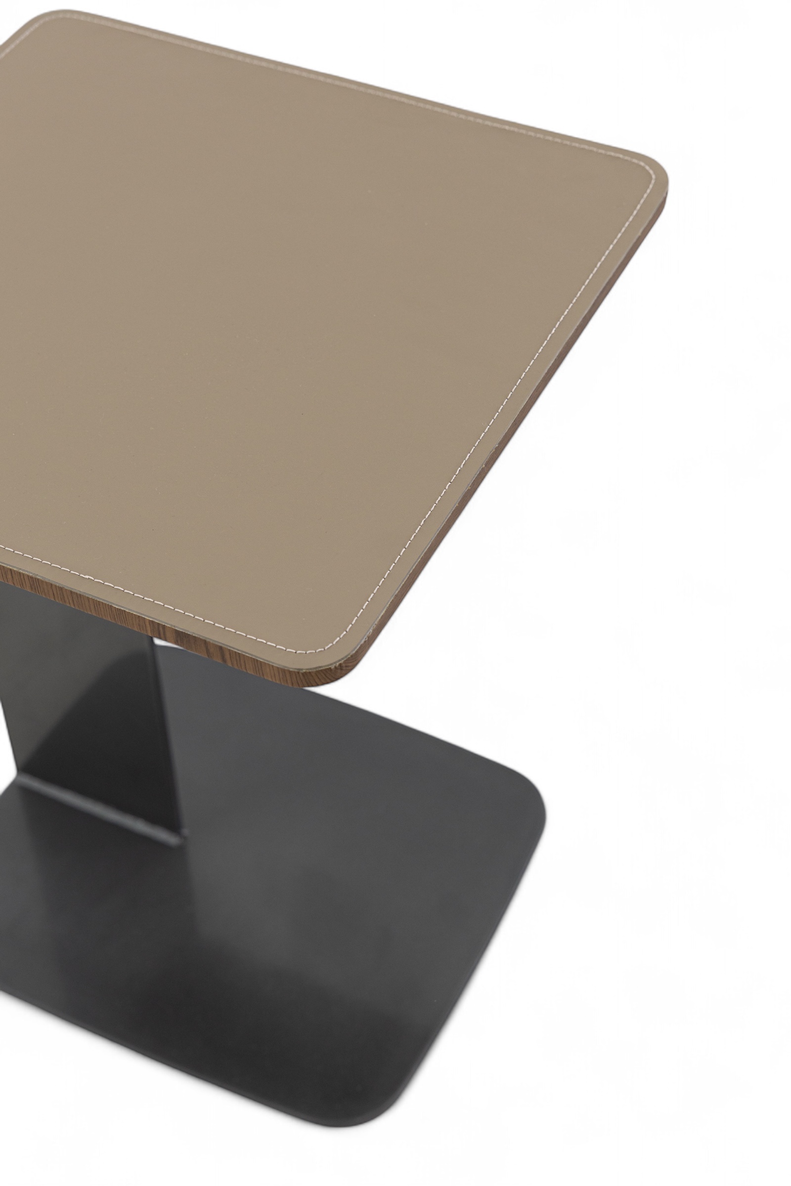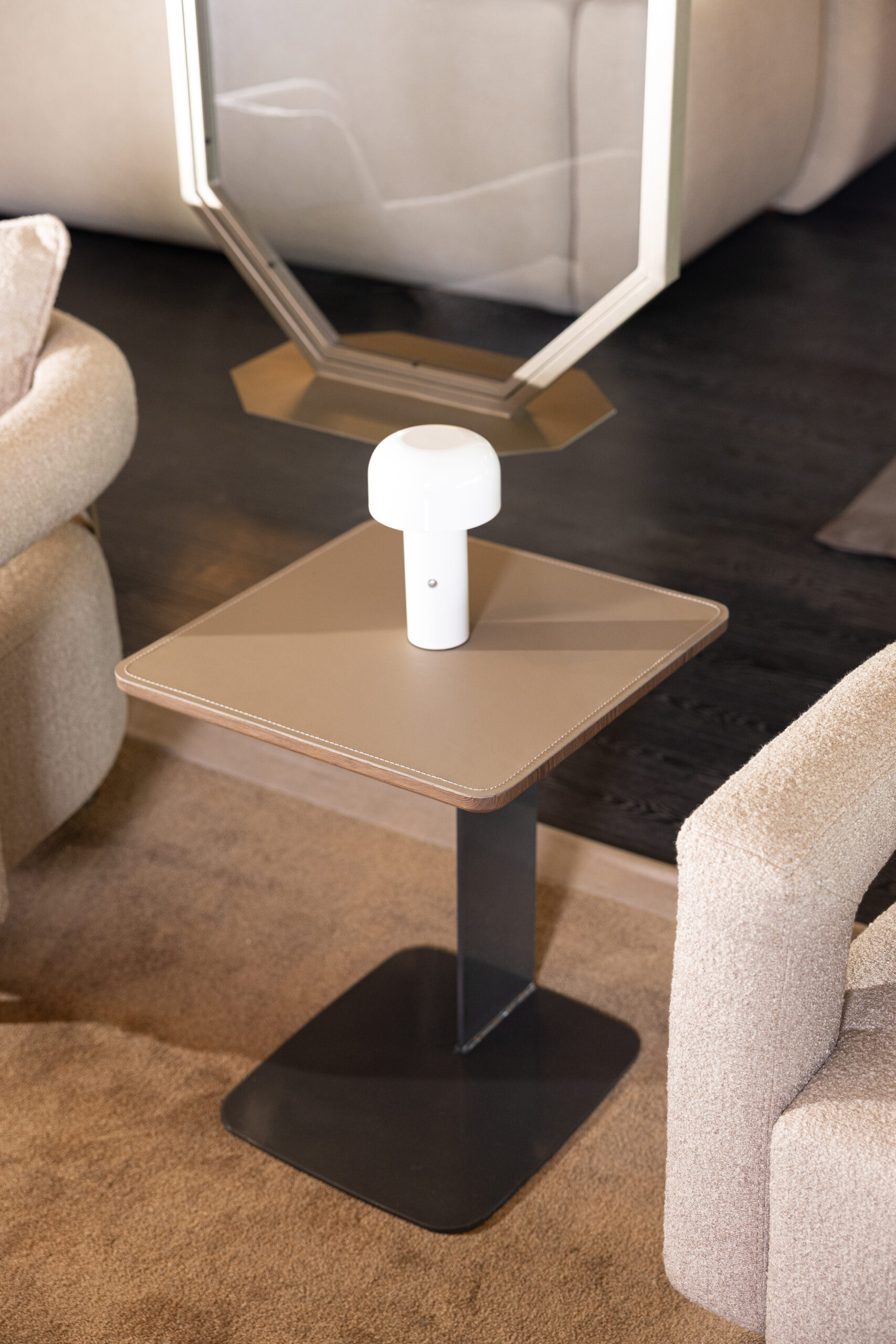 The “Martha” side table embodies quiet sophistication through its minimalist geometry and exquisite balance of materials. Its top, elegantly upholstered in fine leather, introduces a tactile depth that contrasts beautifully with the sleek metal structure beneath. The slender silhouette and soft, square contours evoke a sense of lightness, while the crafted stitching detail along the edges highlights impeccable attention to finish. Designed to complement both contemporary and timeless interiors, “Martha” serves as a refined accent beside a sofa or armchair. Every detail reflects an understated luxury — where form, texture, and proportion meet in effortless harmony.