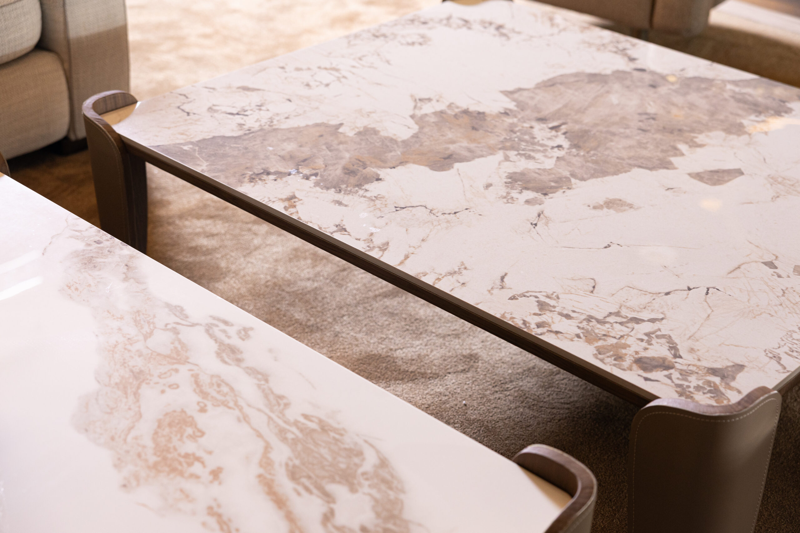 Martha embodies a refined balance of sculptural presence and understated elegance. Its sleek marble top, veined with soft organic patterns, introduces a sense of timeless sophistication while remaining resolutely contemporary.Anchored by four gently rounded corner supports in a smooth leather-like finish, the piece reveals a striking contrast between tactile warmth and polished coolness. With its minimalist form and harmonious proportions, this table serves not only as a functional centerpiece but also as a subtle work of art, elevating the atmosphere of any modern interior.