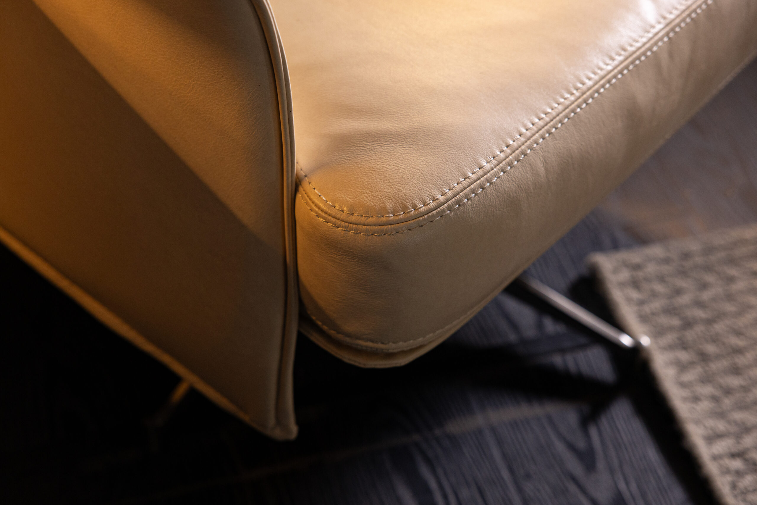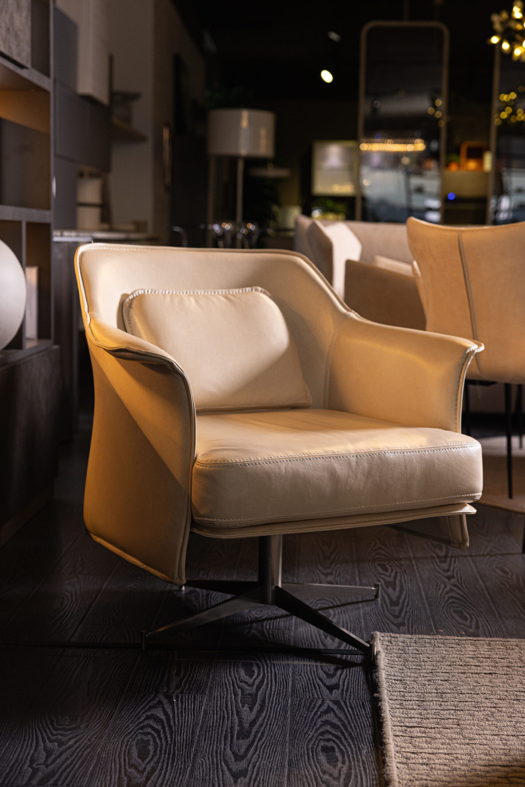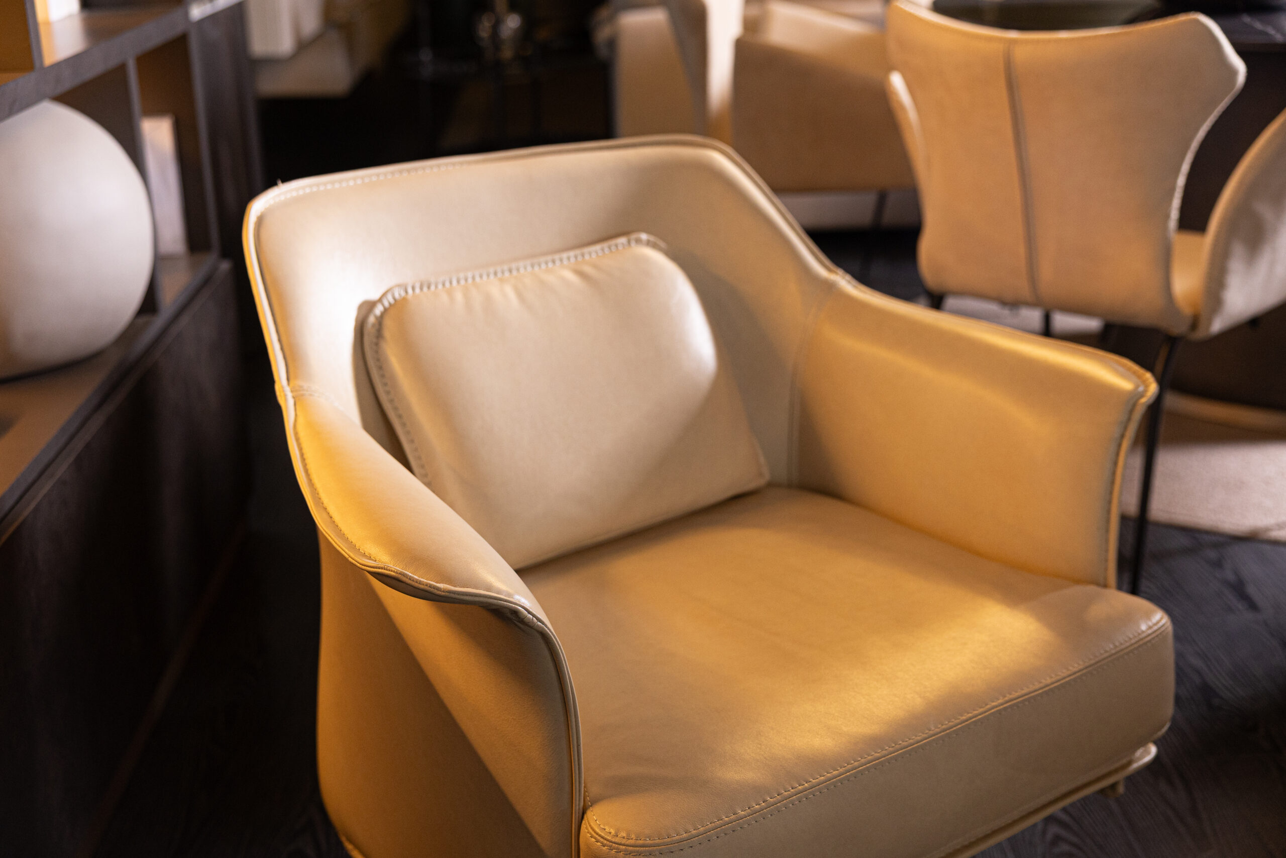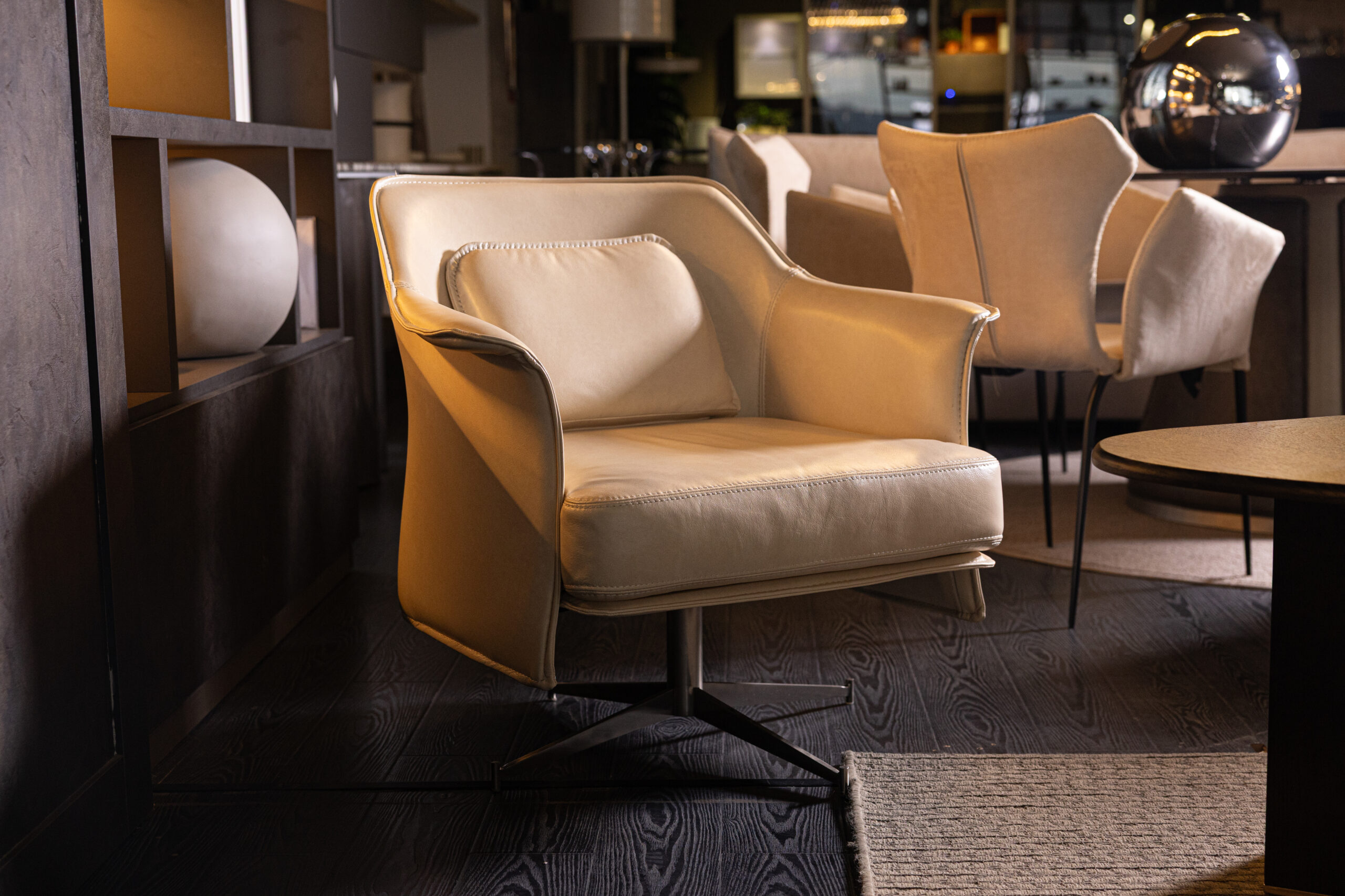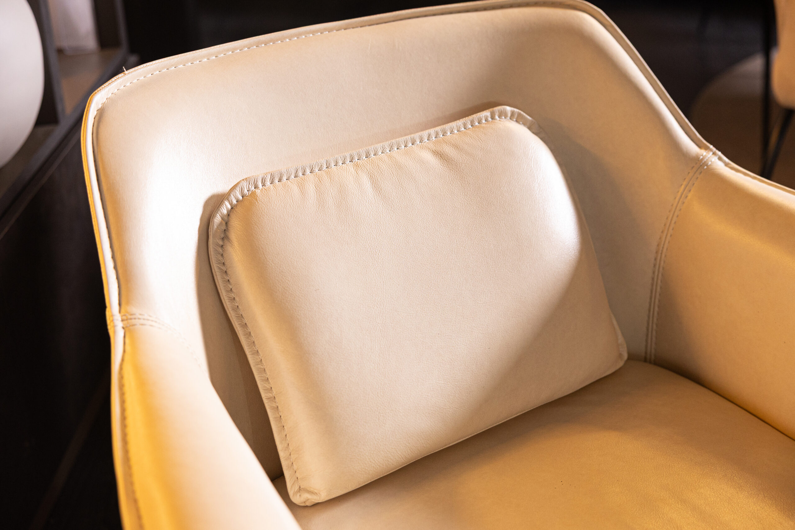 The Mason Armchair is a handcrafted masterpiece combining sophistication and comfort. With a 4-spoke base, curved armrests, and a wide seating area, this leather easy chair offers exceptional support and maneuverability. Made from a fiberglass and resin structure, it ensures durability and longevity. The seat cushion, crafted with high-resiliency polyurethane and polyester fiber, provides ultimate comfort. Available in fabric or leather, the Mason Armchair can be customized to fit any decor. Its sleek metallic finish and artisan craftsmanship make it ideal for contract spaces, restaurants, cafes, or residential settings, blending style with functionality effortlessly.