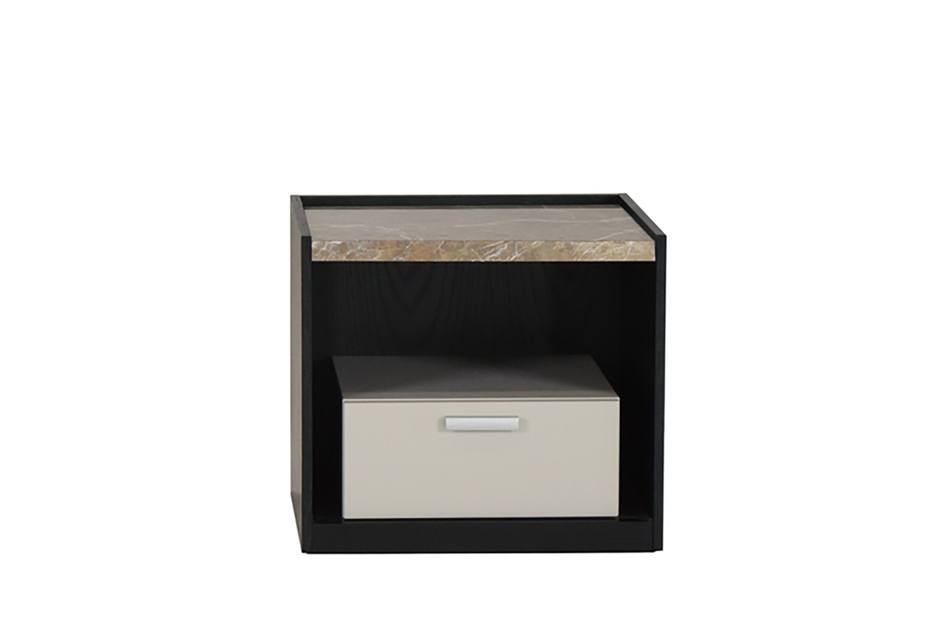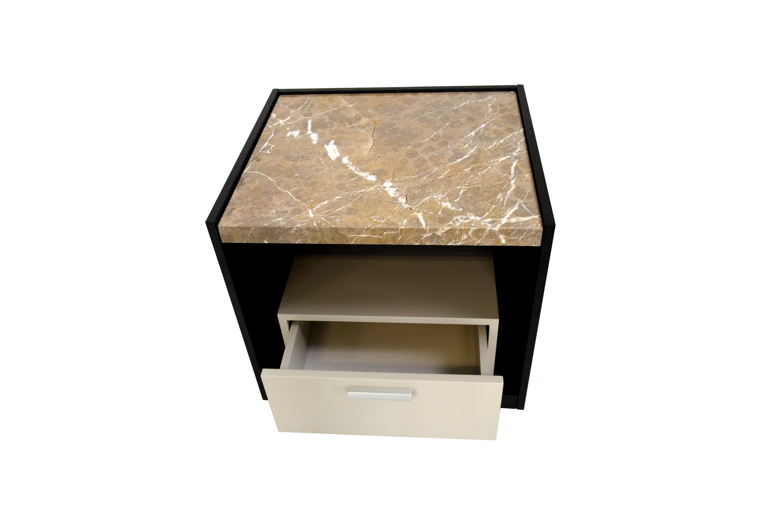 The Mason nightstand by Able is a luxury piece designed to elevate any bedroom. Featuring a generous Emperador Marble tabletop and a Walnut Veneer interior with a dark stain, it blends elegance with practicality. The contrasting white-painted drawer at the center offers convenient storage with a beautifully upholstered base. Known for its meticulous craftsmanship, the Mason nightstand enhances interiors with sophistication and originality. Available in various finishes, it can be customized to suit personal preferences. With its seamless integration into both residential and commercial spaces, the Mason nightstand embodies a perfect balance of style, functionality, and quality.