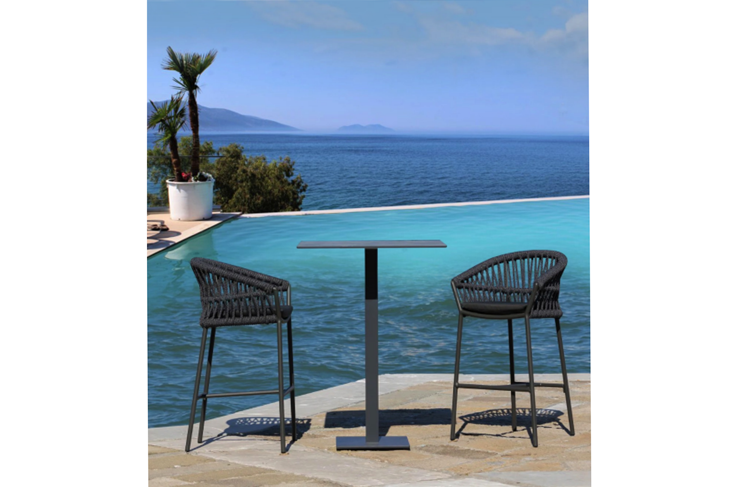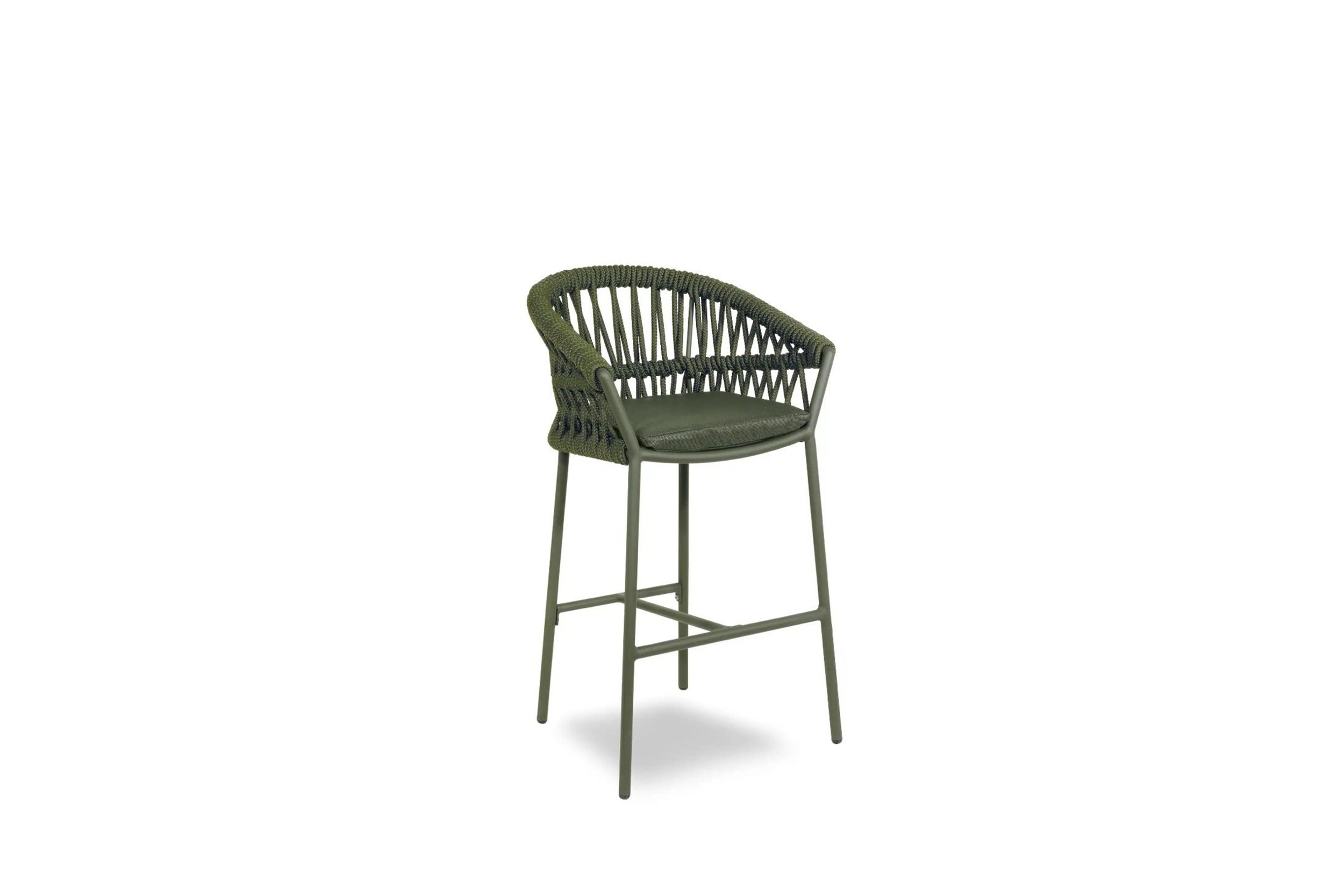 This MONICA bar stool is both stylish and comfortable. The Drop, with its robust aluminium sub-frame, handwoven Textilene rope, and upholstered seat pad, will look great in any indoor or outdoor area.Powdercoated aluminium frame, 18 mm textilene/polyolefin rope, and axroma outdoor fabric cushion are the materials used.