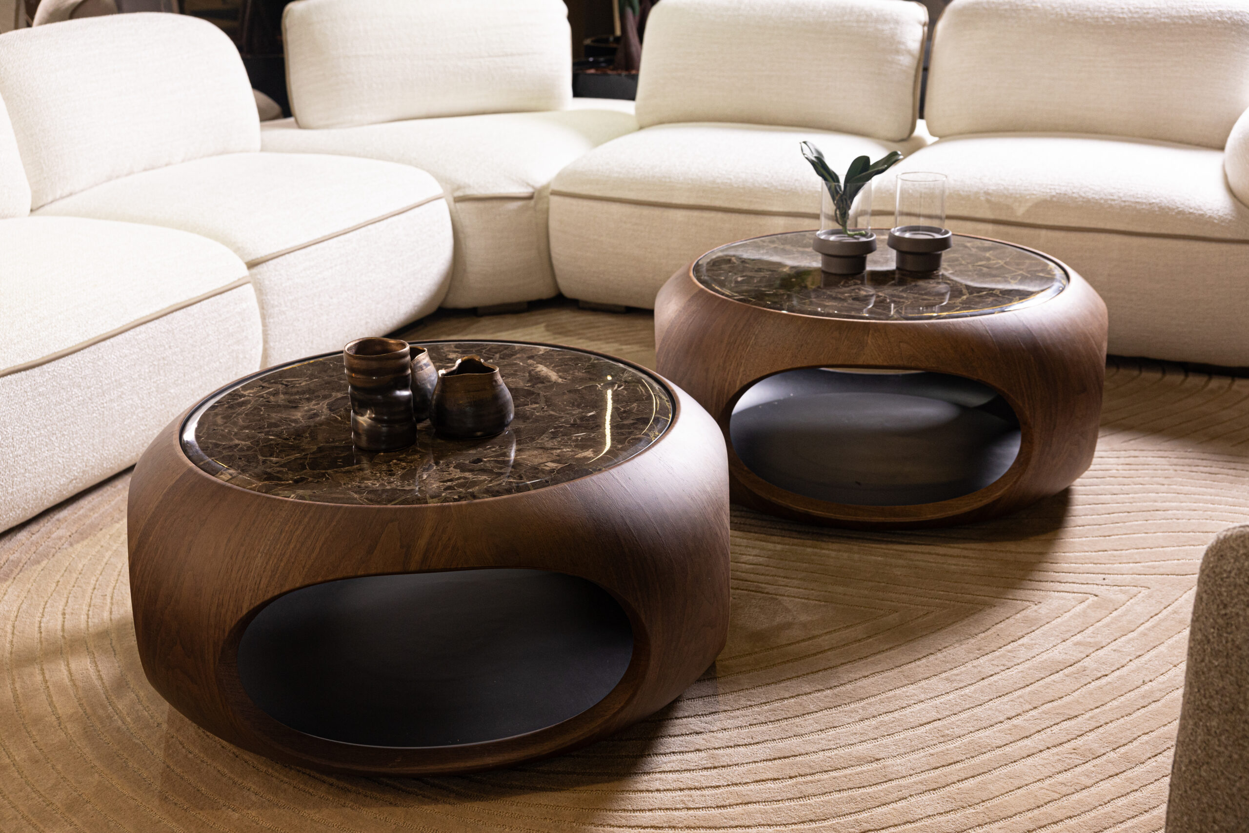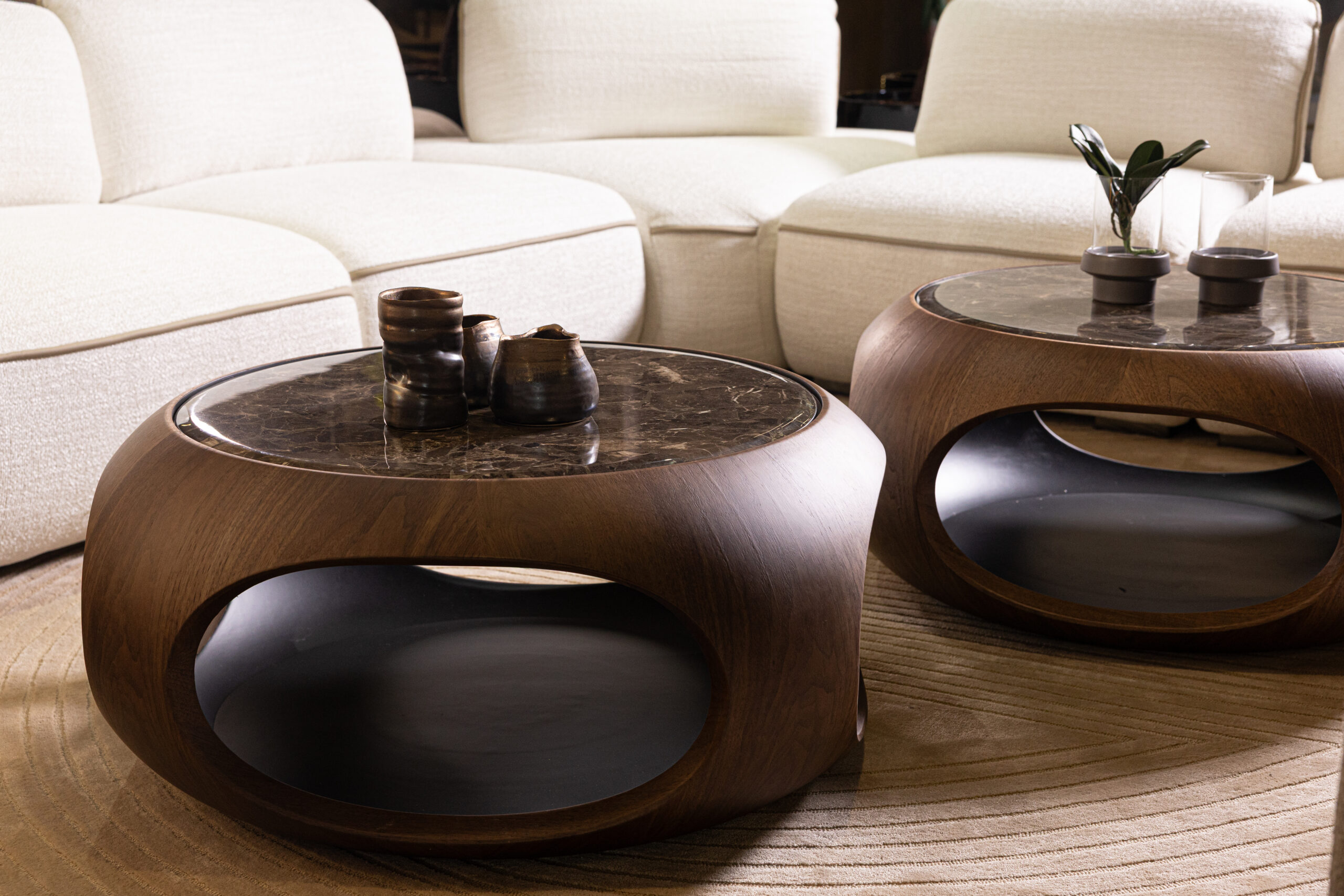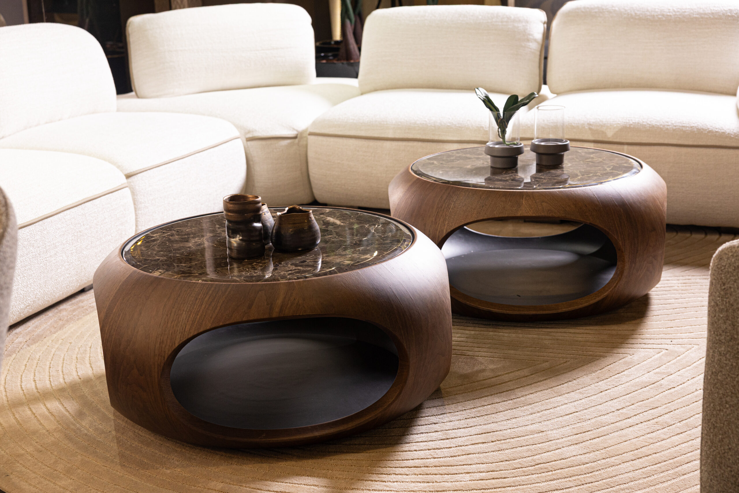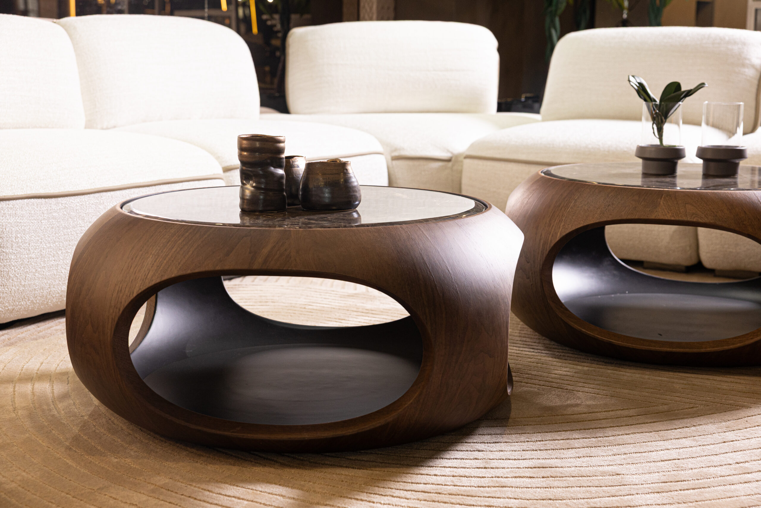 This sculptural coffee table pairs an organic, monolithic silhouette with meticulous, high-end craftsmanship. Its rounded wooden frame is precision-milled to create continuous curves and open side niches that add both visual lightness and functional storage. The surface features a polished marble top, selected for its rich veining and structural durability, seamlessly integrated into the form. Designed as a statement piece, it brings together tactile warmth and refined architectural presence in any contemporary interior.