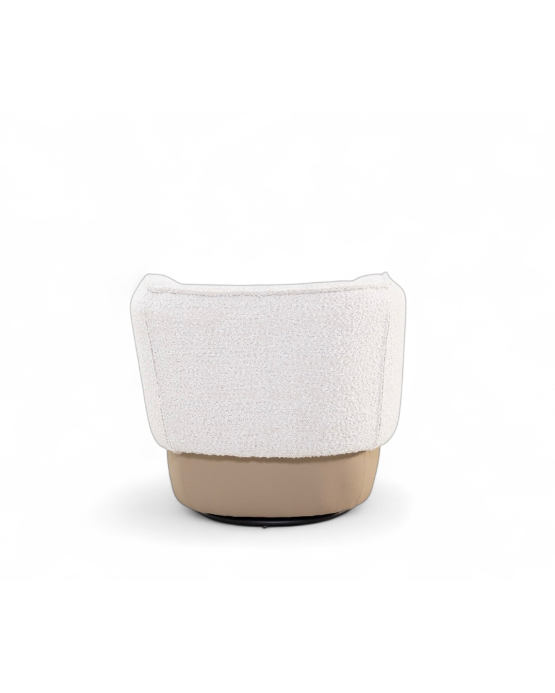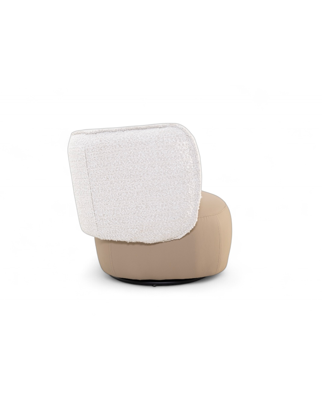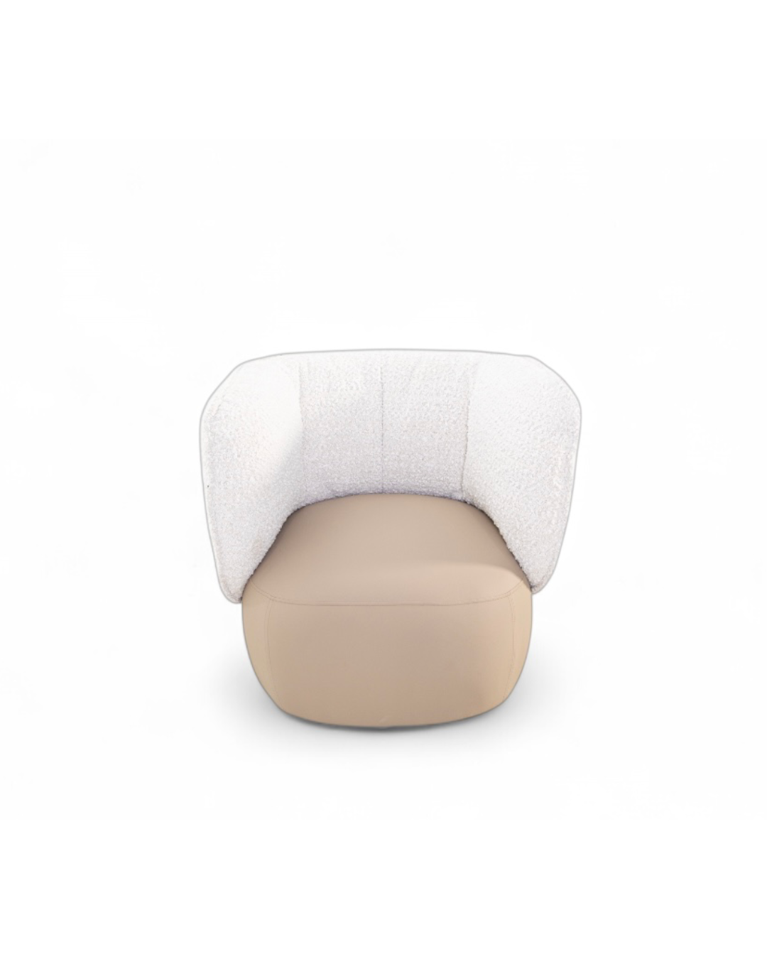 This sculptural armchair brings a sense of modern refinement with its rounded silhouette and inviting proportions. The tactile boucle backrest contrasts beautifully with the smooth, leather-like seat, creating a dialogue between softness and structure. Designed with contemporary elegance in mind, it offers both comfort and a statement presence in any living space. Its enveloping form adds a touch of intimacy, making it perfect for refined lounge settings or stylish reading corners.