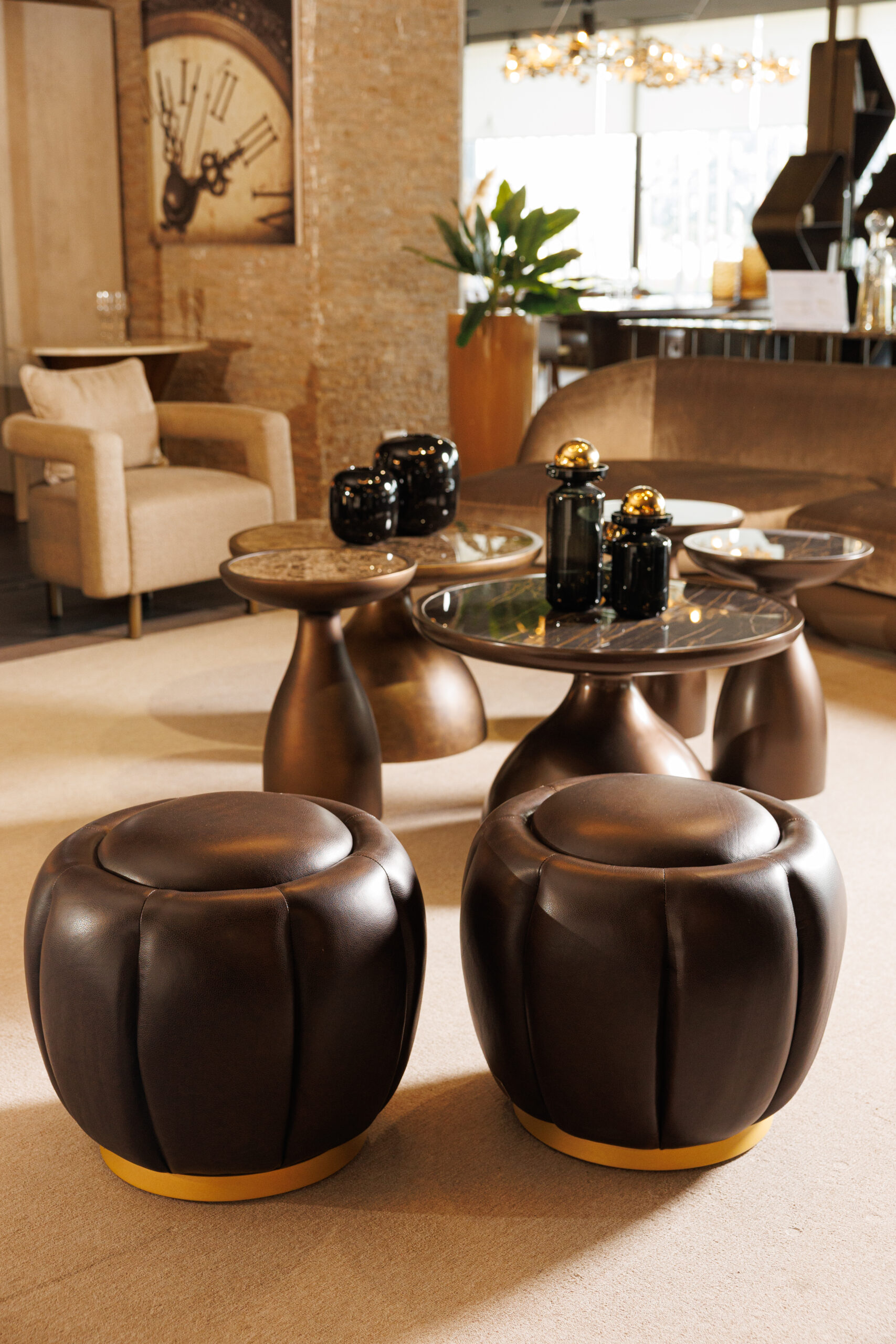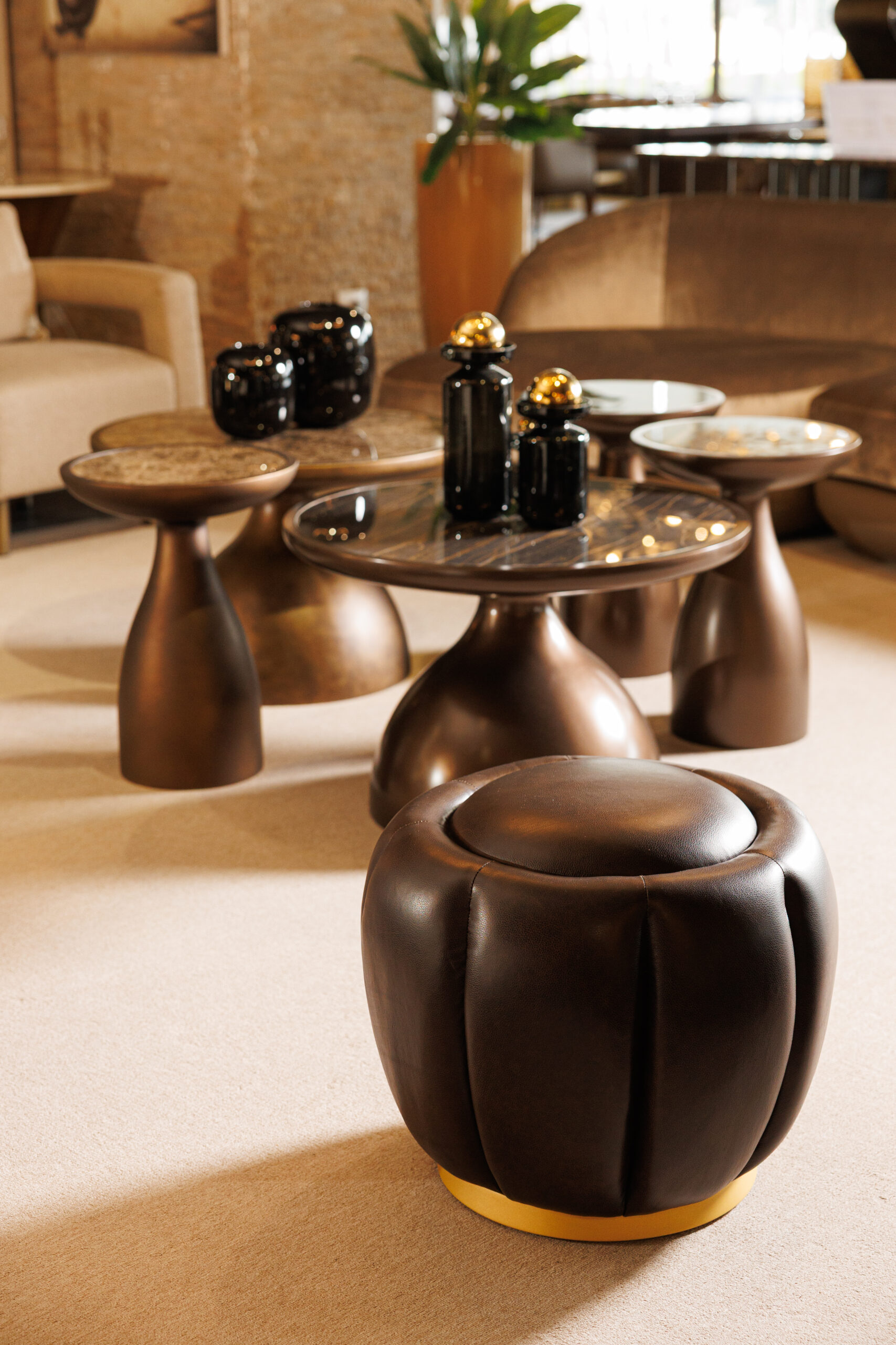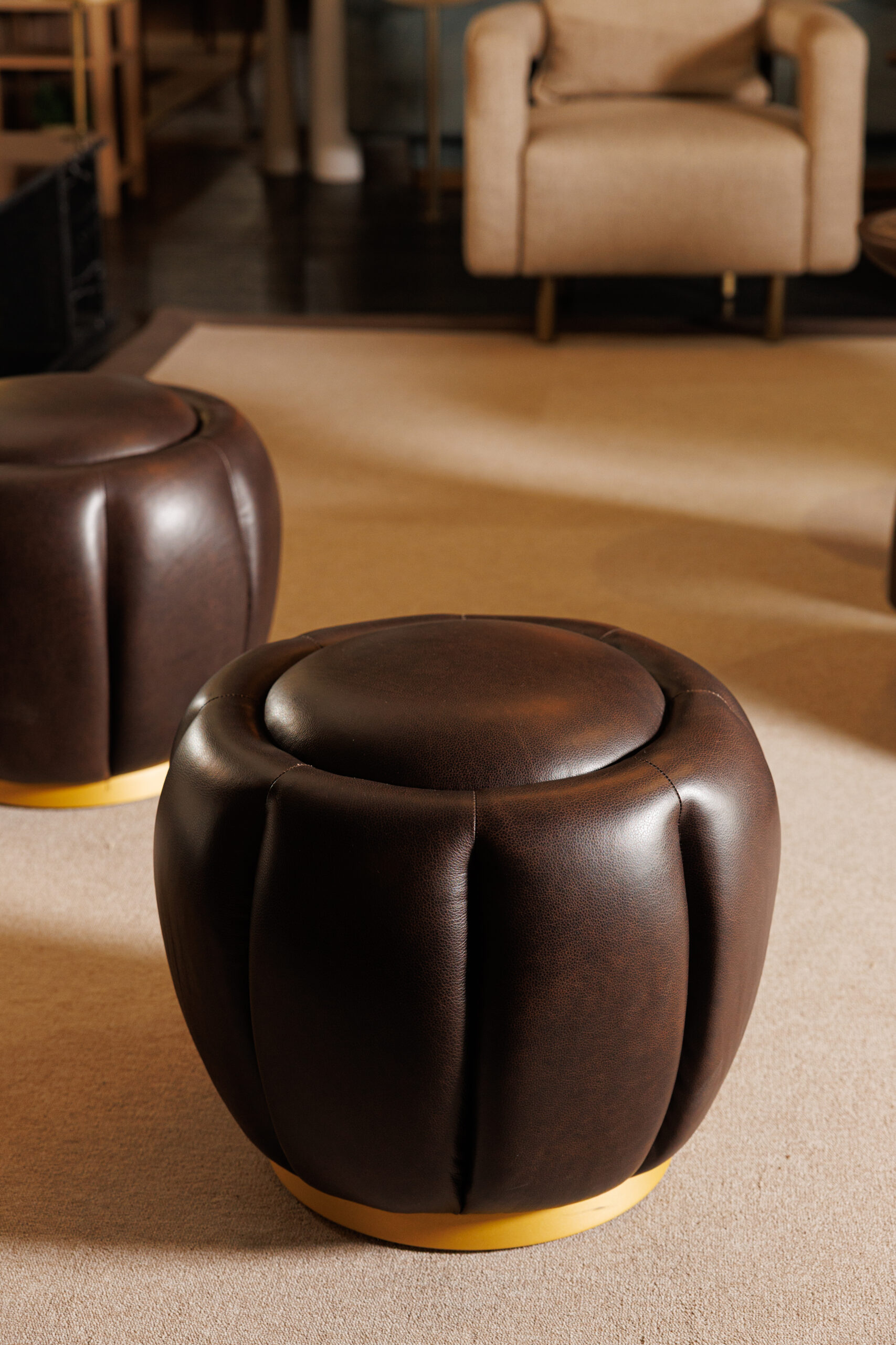 Selena poufs by Able Design Studio feature a captivating design inspired by blooming flowers, with vertical padding motifs adding elegance. The high-quality fabric upholstery reflects light, creating stunning visual effects. The bright laminated wood bases come in seven finishes, including copper, brass, and gunmetal, allowing for seamless customization. Upholstered in a wide range of fabrics and leathers from Able’s extensive collection, each pouf is tailored to suit individual preferences. These versatile poufs are ideal for both residential and commercial spaces, combining style, sophistication, and exceptional craftsmanship to elevate any environment.