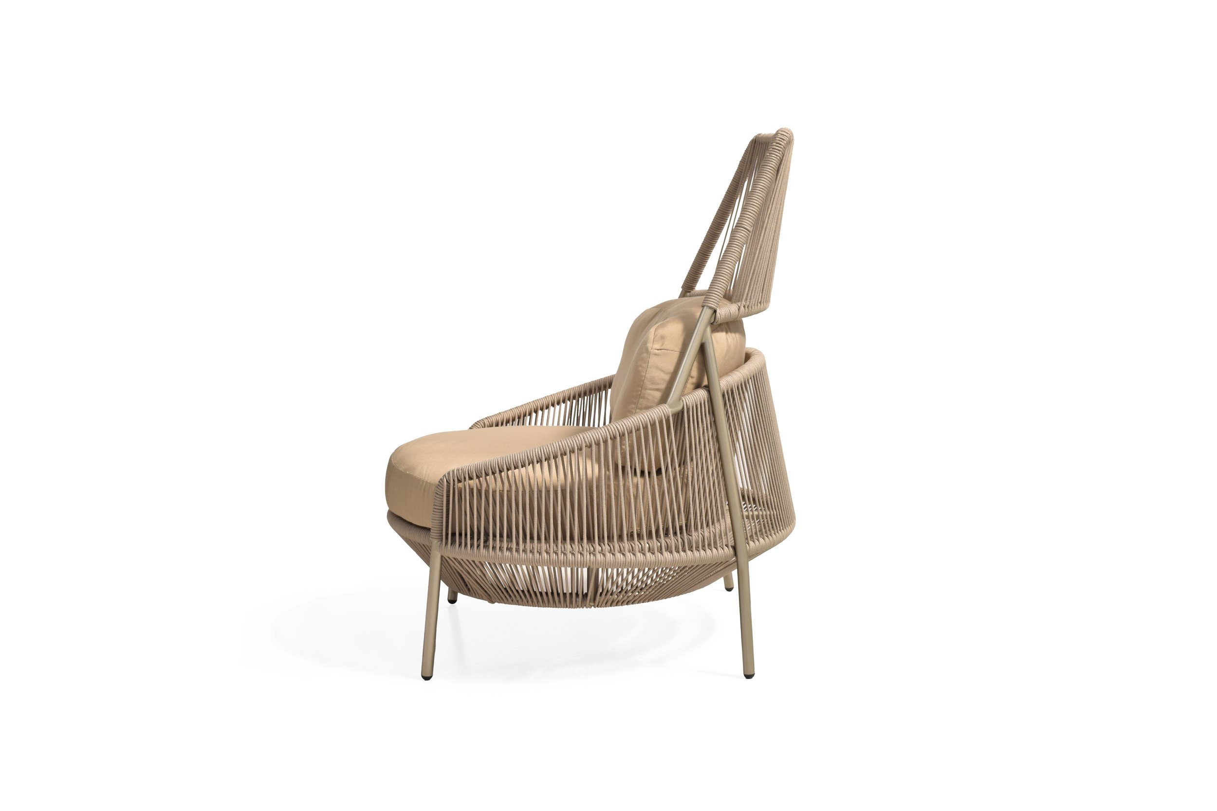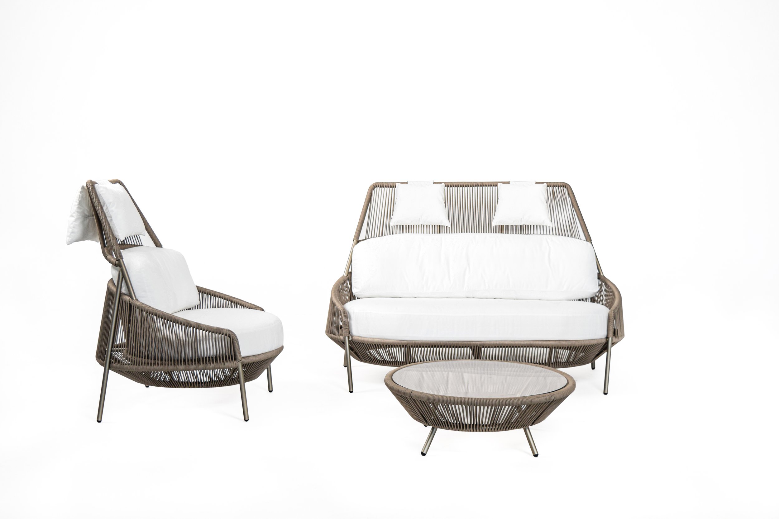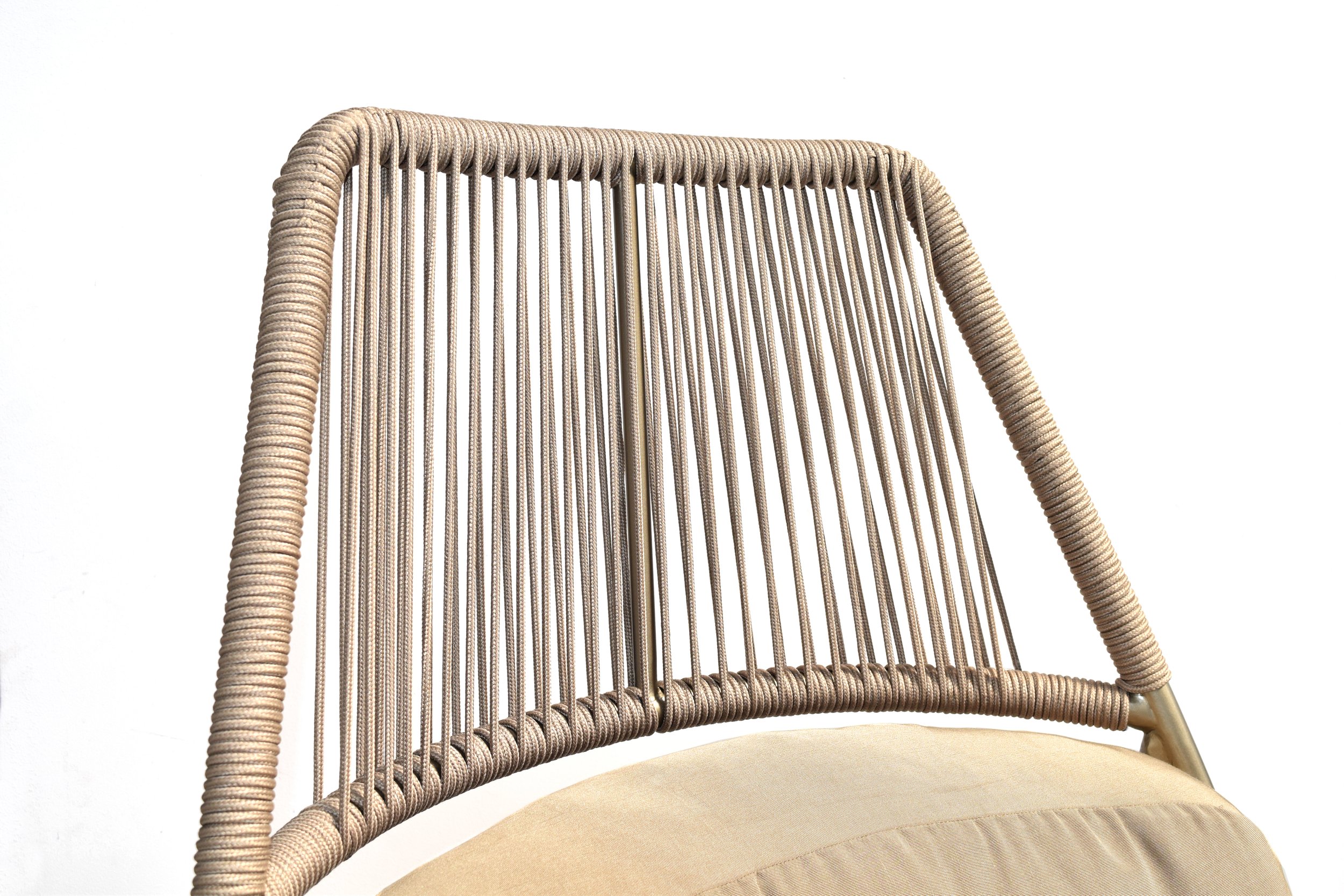 Our Sunray Max Outdoor Collection presents a contemporary design and is part of a series that includes a Sofa and two distinct armchair models. These pieces are crafted with a lightweight aluminum frame that can be enhanced with unique metallic shades, creating a stunning and long-lasting product. The customization options include selecting the colors and density of the rope, choosing the aluminum color, and deciding on the inner fabric.