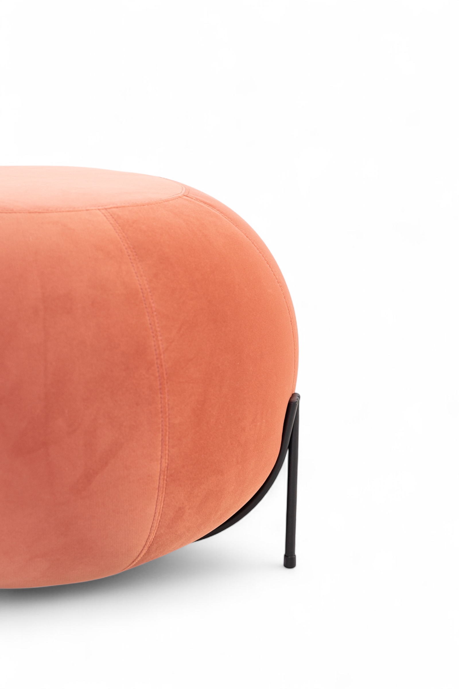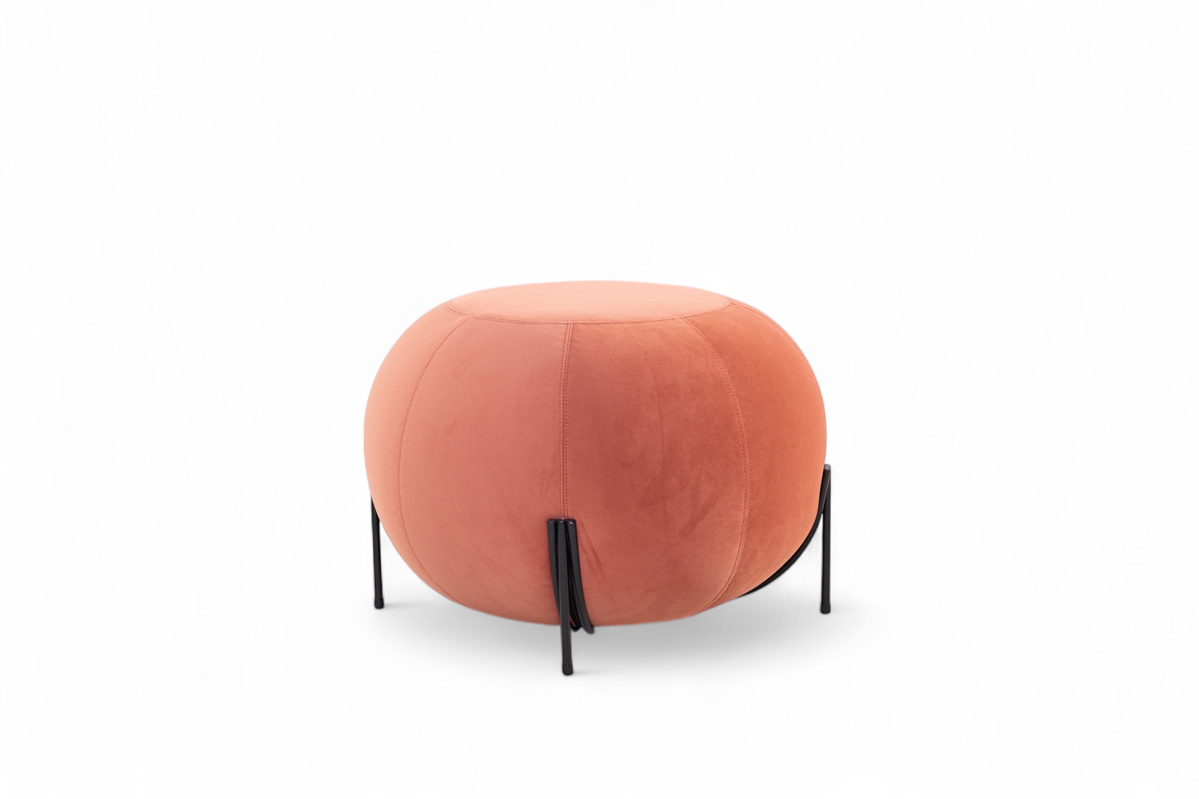 Defined by sculptural softness and contemporary elegance, the “Terra” pouf introduces a sense of effortless sophistication to any setting. Its rounded silhouette, delicately upholstered in a velvety coral fabric, evokes both warmth and visual harmony. Supported by sleek, black metal legs, the design achieves a graceful balance between lightness and volume. The tactile surface invites touch, while its refined proportions make it a versatile accent piece for living areas, dressing corners, or lounge environments. A statement of modern craftsmanship, “Terra” embodies comfort reimagined through minimalist artistry.