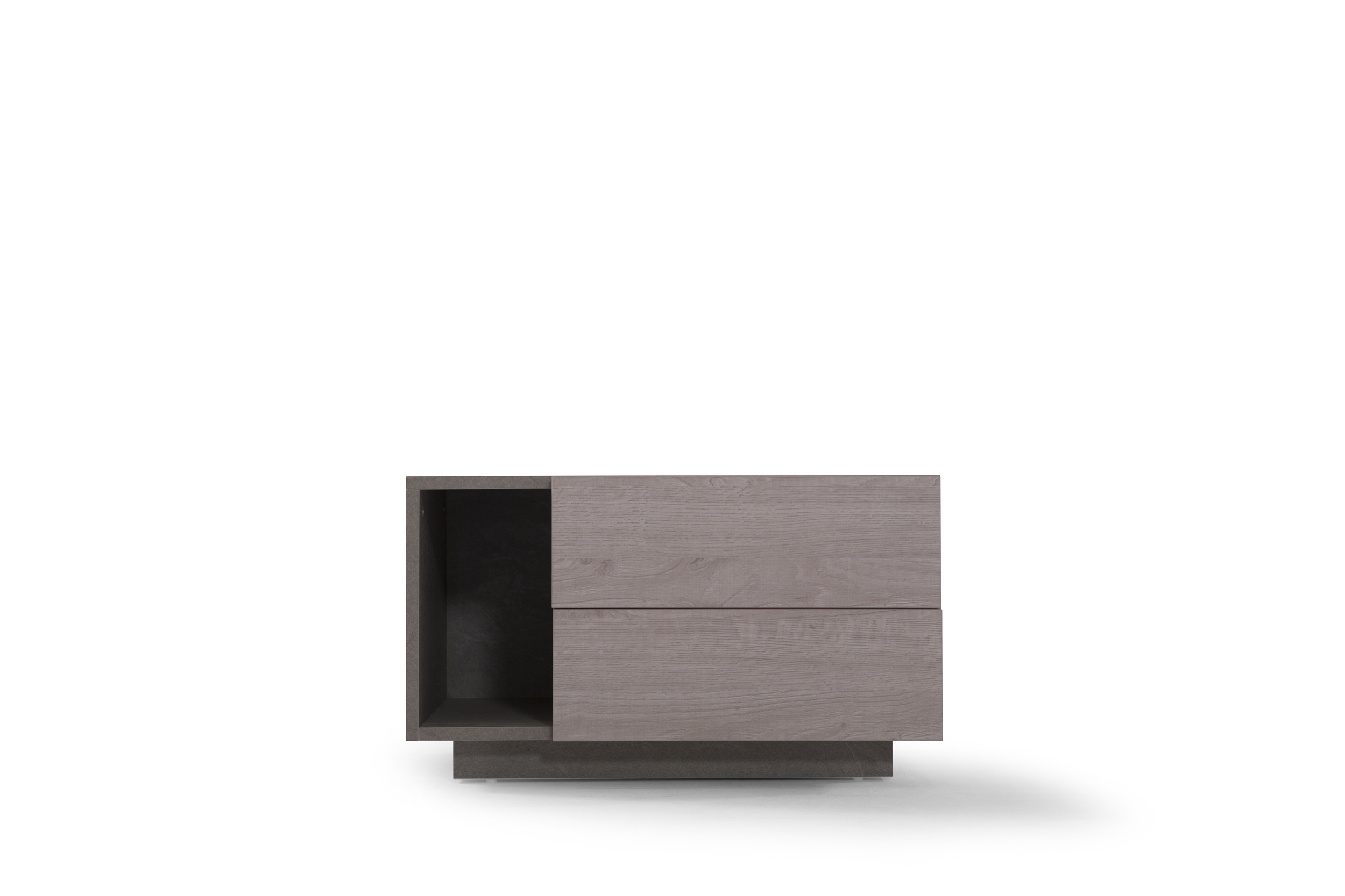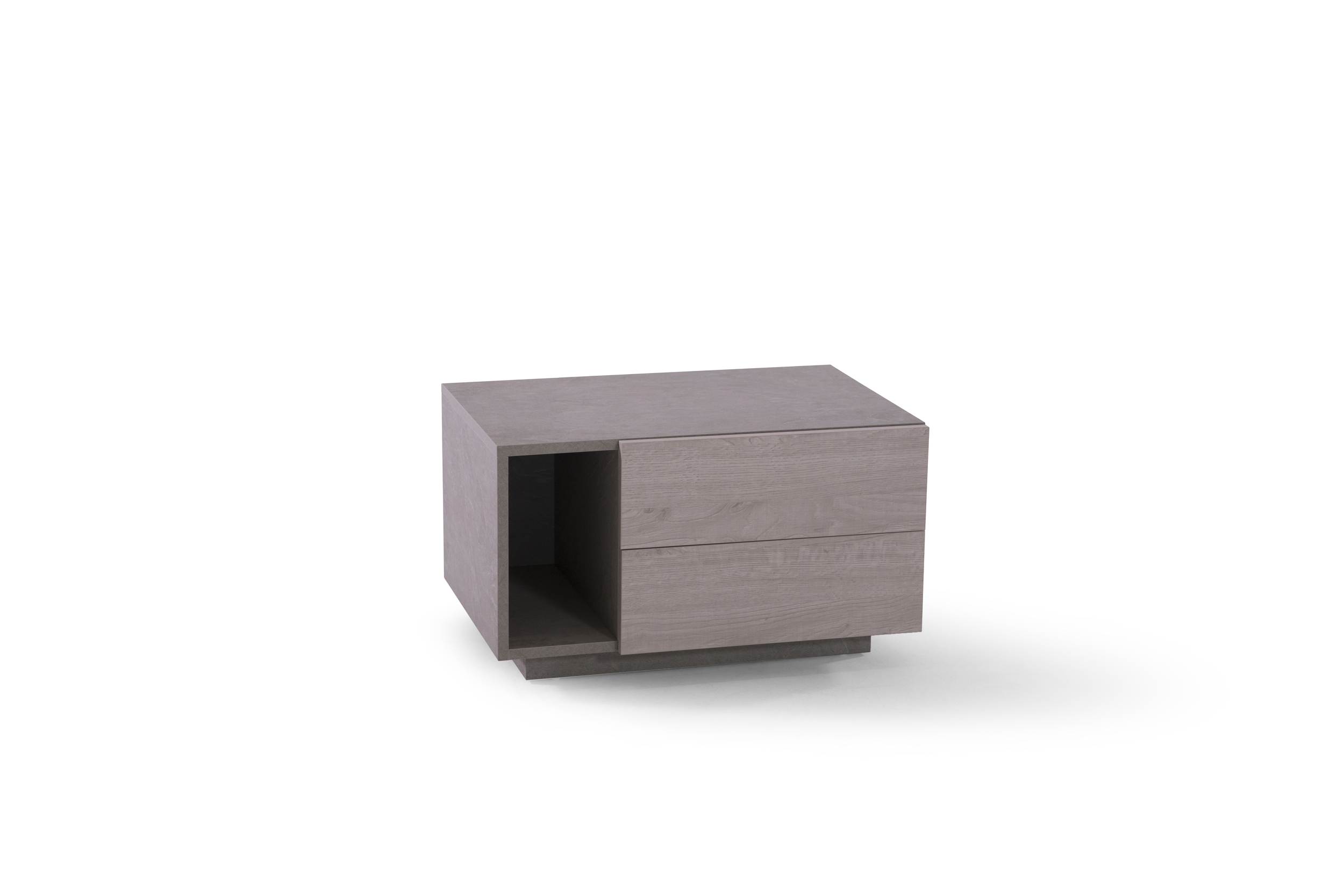 The Great Void represents a dynamic nightstand characterized by large vertical vents to store books, magazines, and other valuables for quick access, while also offering the conventional double-drawer availability for your more personal items readily available by your bedside.